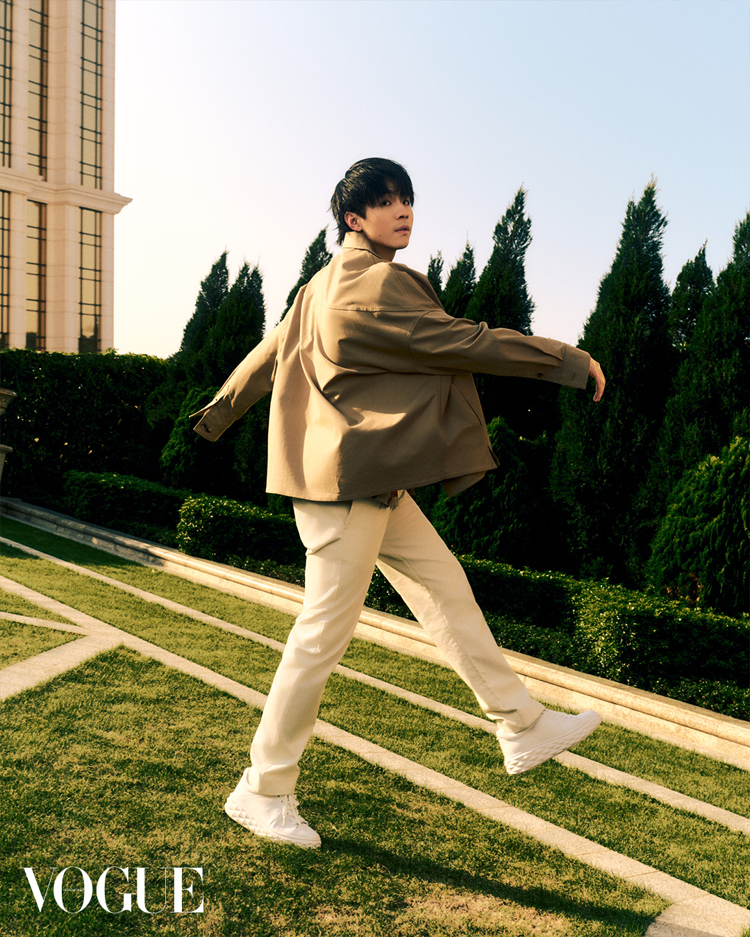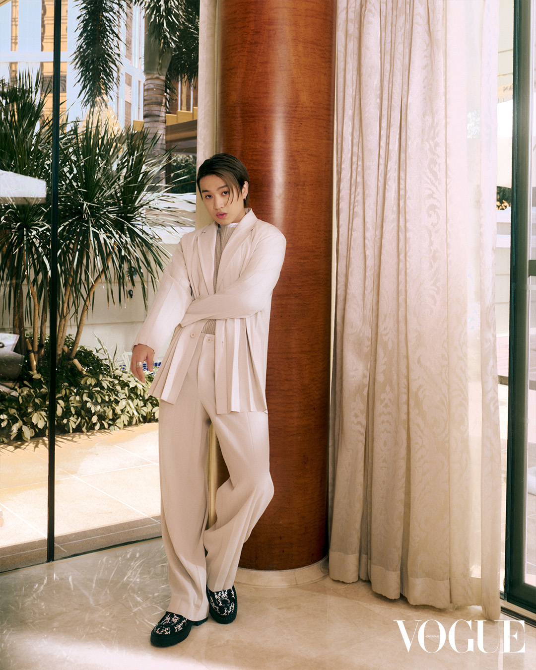 On Jer Lau: Blazer, top and pants, all Homme Plissé Issey Miyake. Shoes, Jimmy Choo.