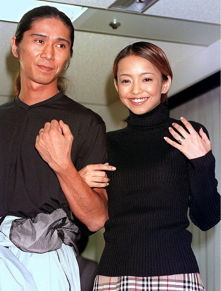 TOKYO, JAPAN: Namie Amuro (L), a 20-year-old Japanese female pop singer and idol of Japanese teenagers poses with her fiance Masaharu Maruyama, the 35-year-old leader of a dance music group at a press conference in Tokyo 23 October. Amuro, originally from Japan's southern island of Okinawa, has made dyed-brown hair and high-heel boots a fashion among young Japanese. Her fellower are known as Amurer. JIJI PRESS-AFP PHOTO (Photo credit should read JIJI PRESS/AFP/Getty Images)