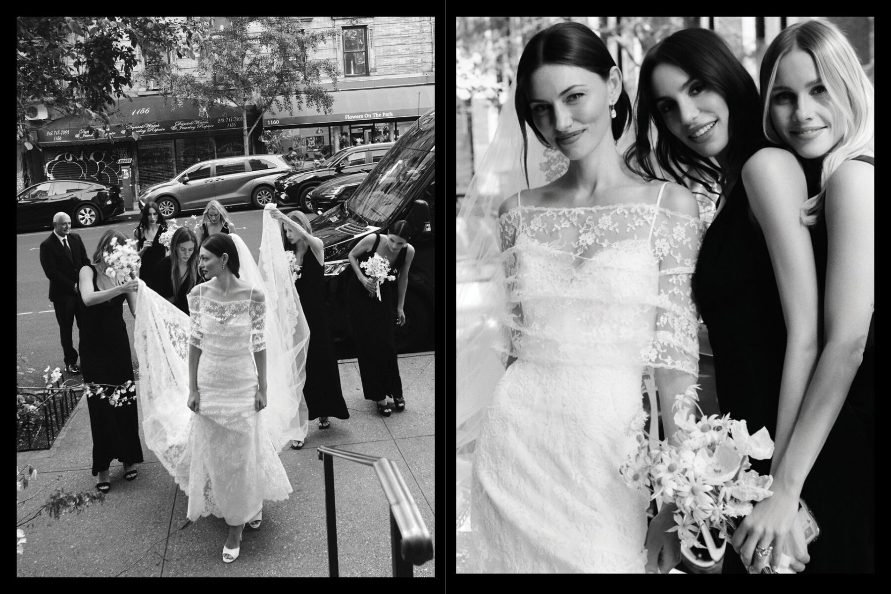 如同在紐約市的任何夜晚,時尚總是重要元素。伴娘們身著着Toteme禮服,新郎則選擇Huntsman設計的經典婚禮套裝維持一貫風格。而新娘Phoebe則為每個場合精心搭配不同造型——在Mr. Chow餐廳舉辦的溫馨預演晚宴上,她穿着John Galliano那件具標誌性的復古報章印花裙裝。「向Carrie Bradshaw致敬。」這位演員如此註解,並搭配Ana Khouri珠寶亮相。