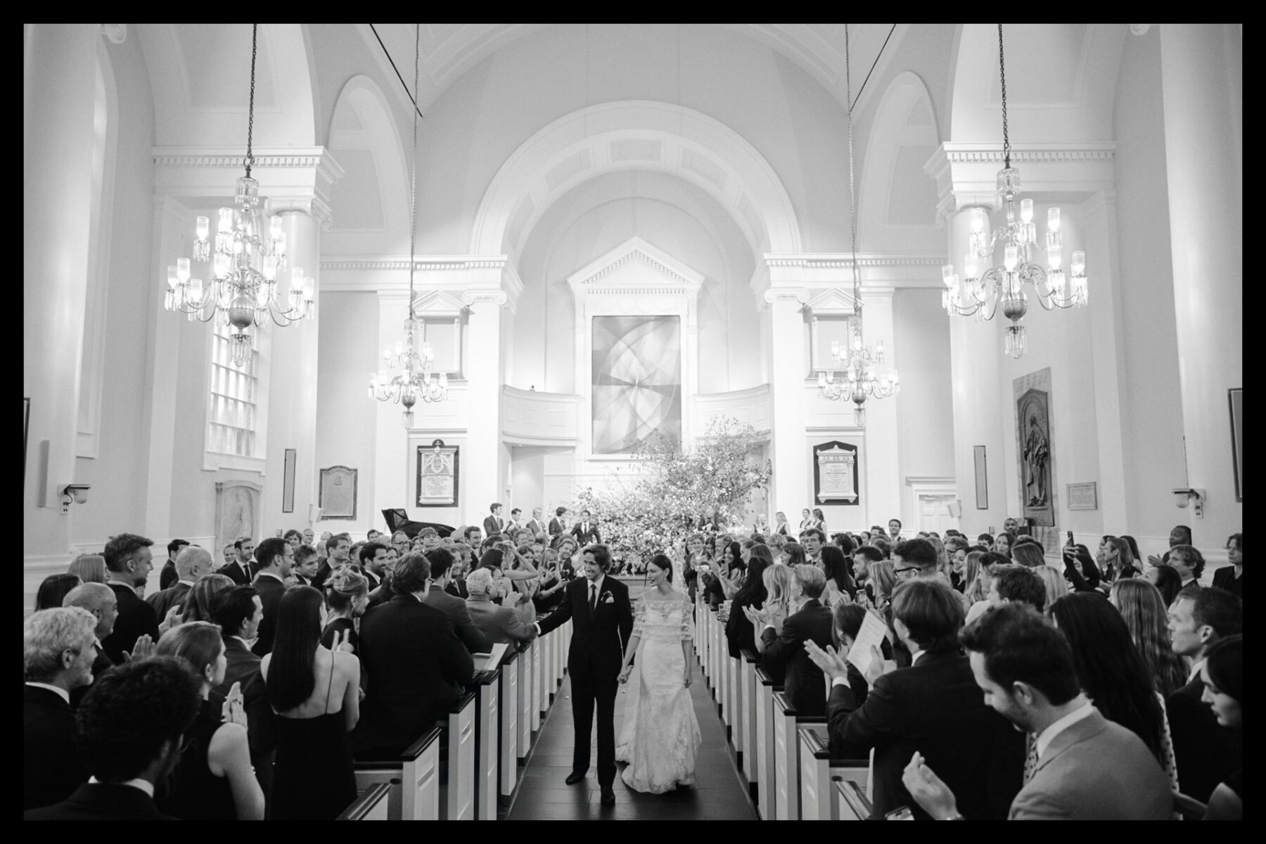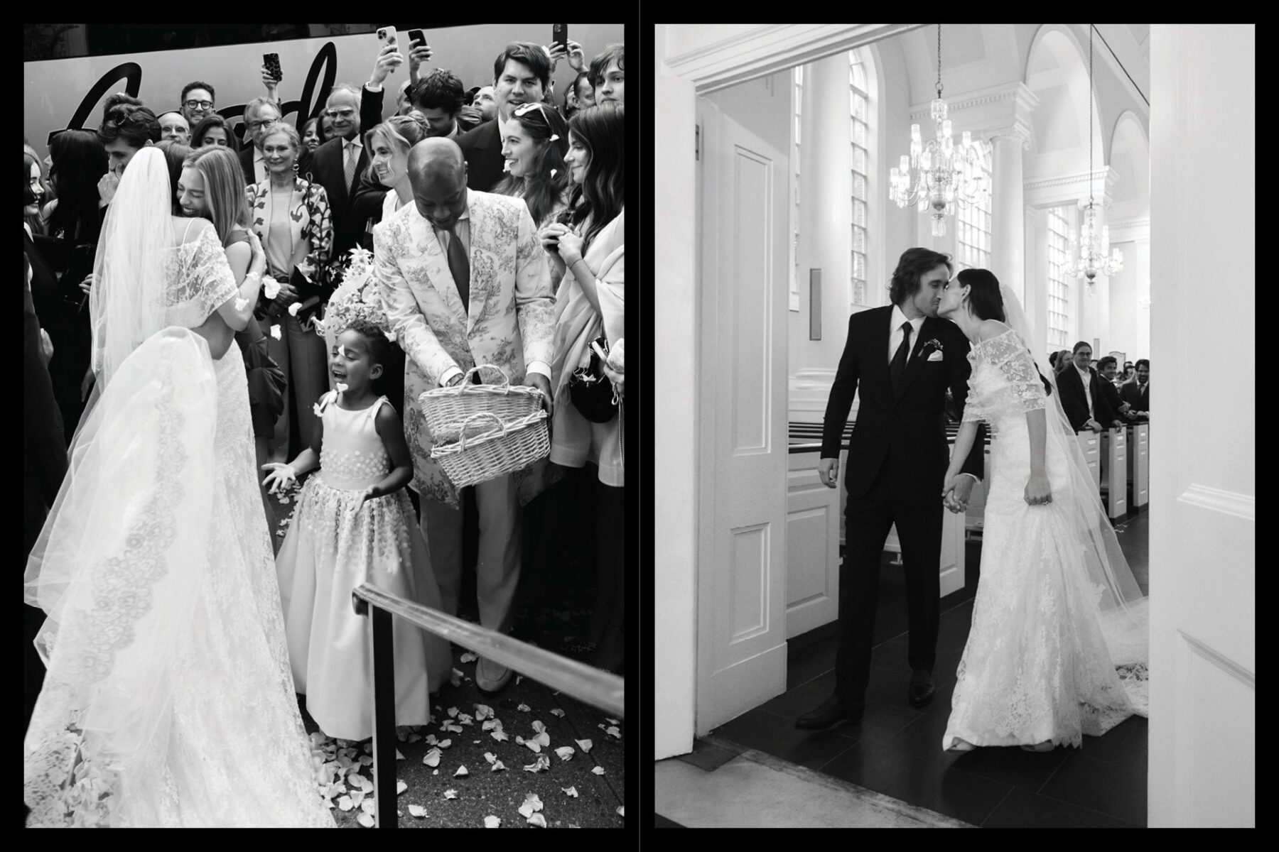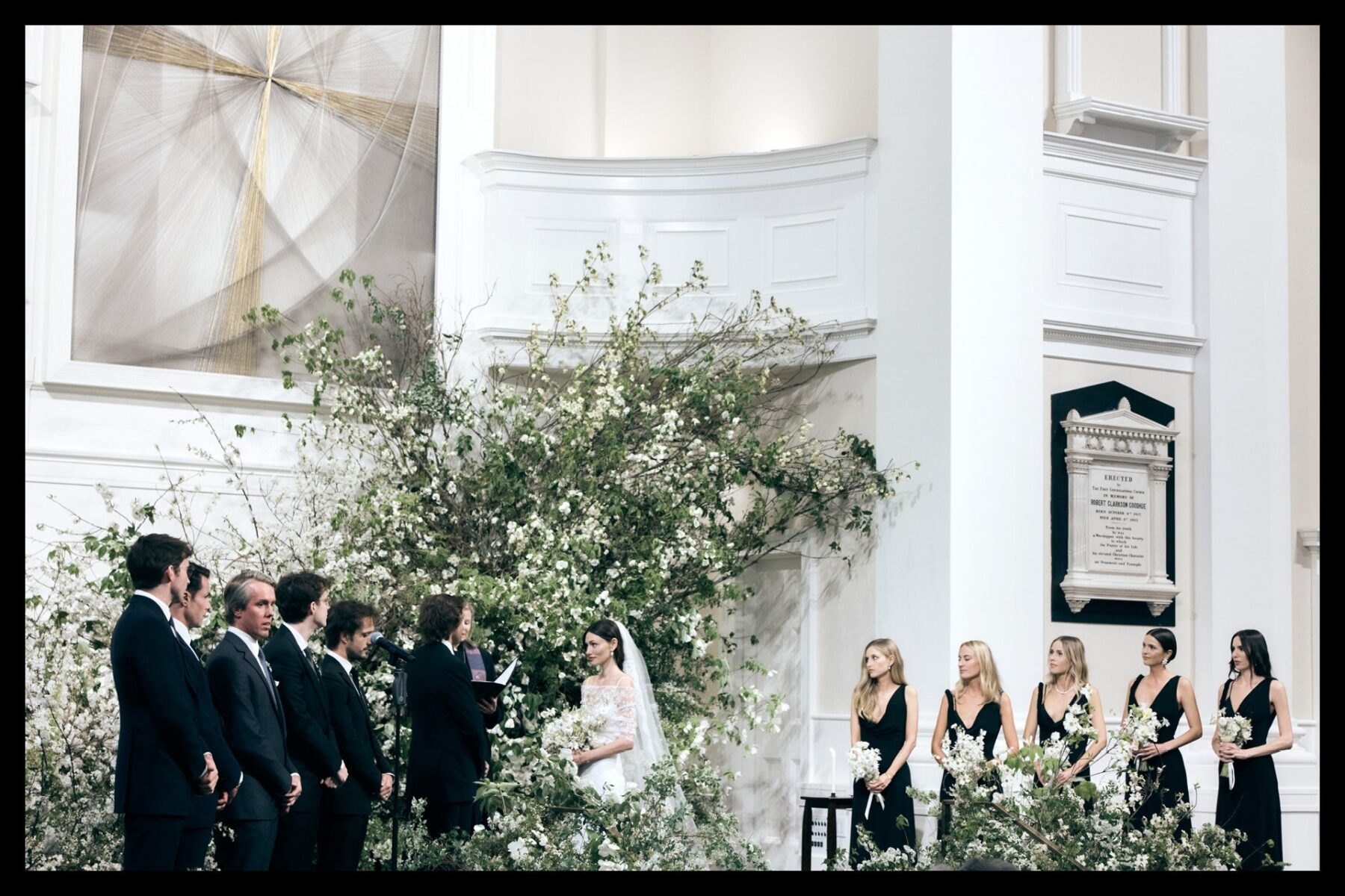 梳妝完畢後,新娘與婚禮團隊抵達上東區的All Souls教堂。「儀式首支樂曲選用《傲慢與偏見》(Keira Knightley與Mathew Macfayden主演版)的〈Dawn〉。」新娘透露,「一來我深愛這首樂曲,二來朋友們總調侃我會不會戴繫帶帽穿束腰胸衣走紅毯——他們都知道我多迷戀時代劇。這前奏響起肯定逗笑大家。」當 Nick Cave的〈Lavender Fields〉旋律響起時,她隨着伴娘們走向聖壇。「當我踏上紅毯看見Bernie,還有FlowerPsycho花藝師April Johnson打造的絕美花卉時,父親不得不悄聲提醒我記得呼吸。」Phoebe分享道,「那一刻美得令人窒息。」