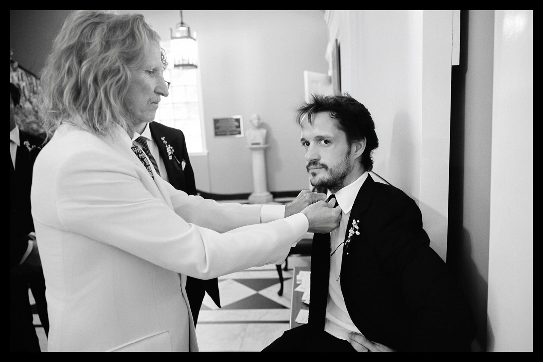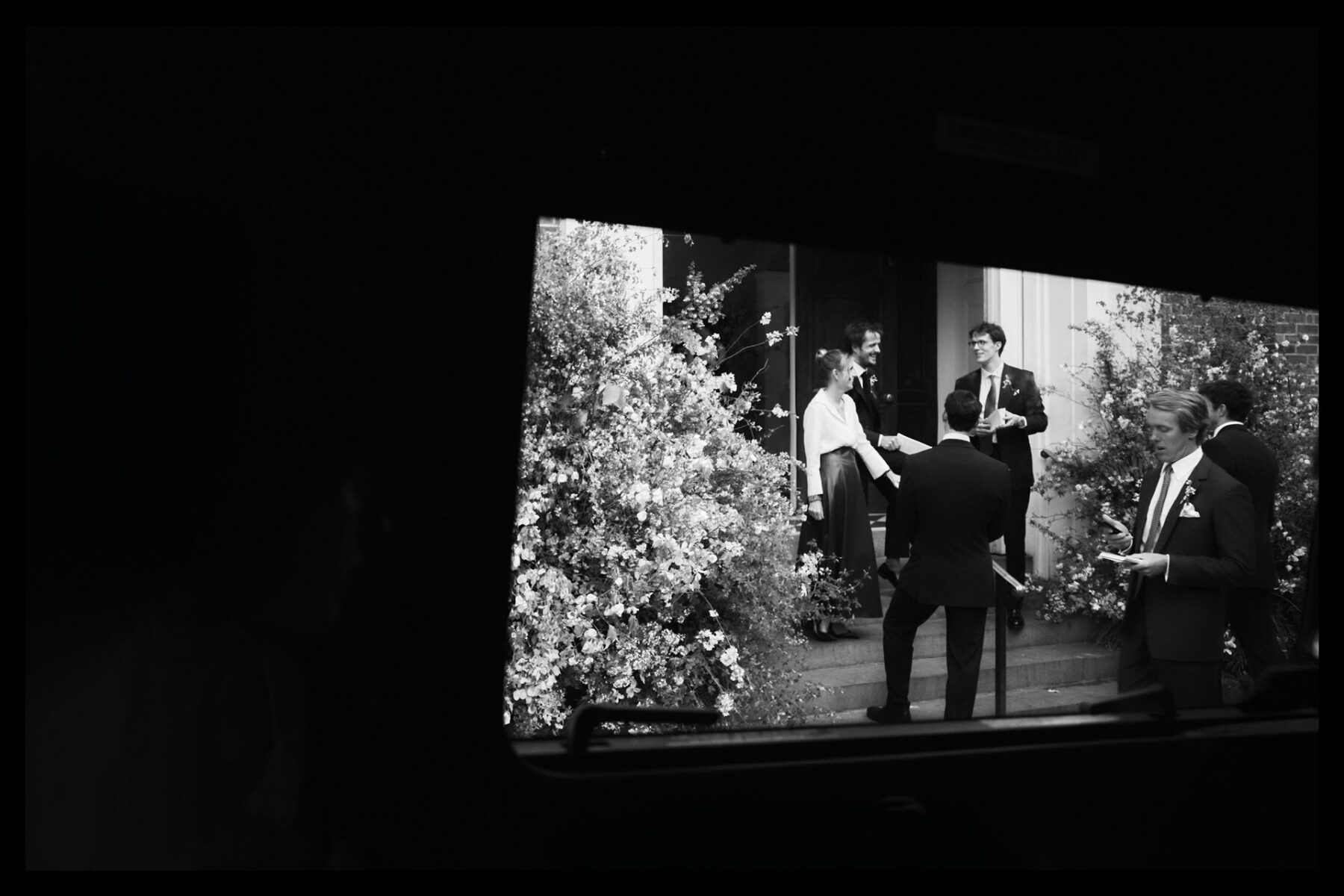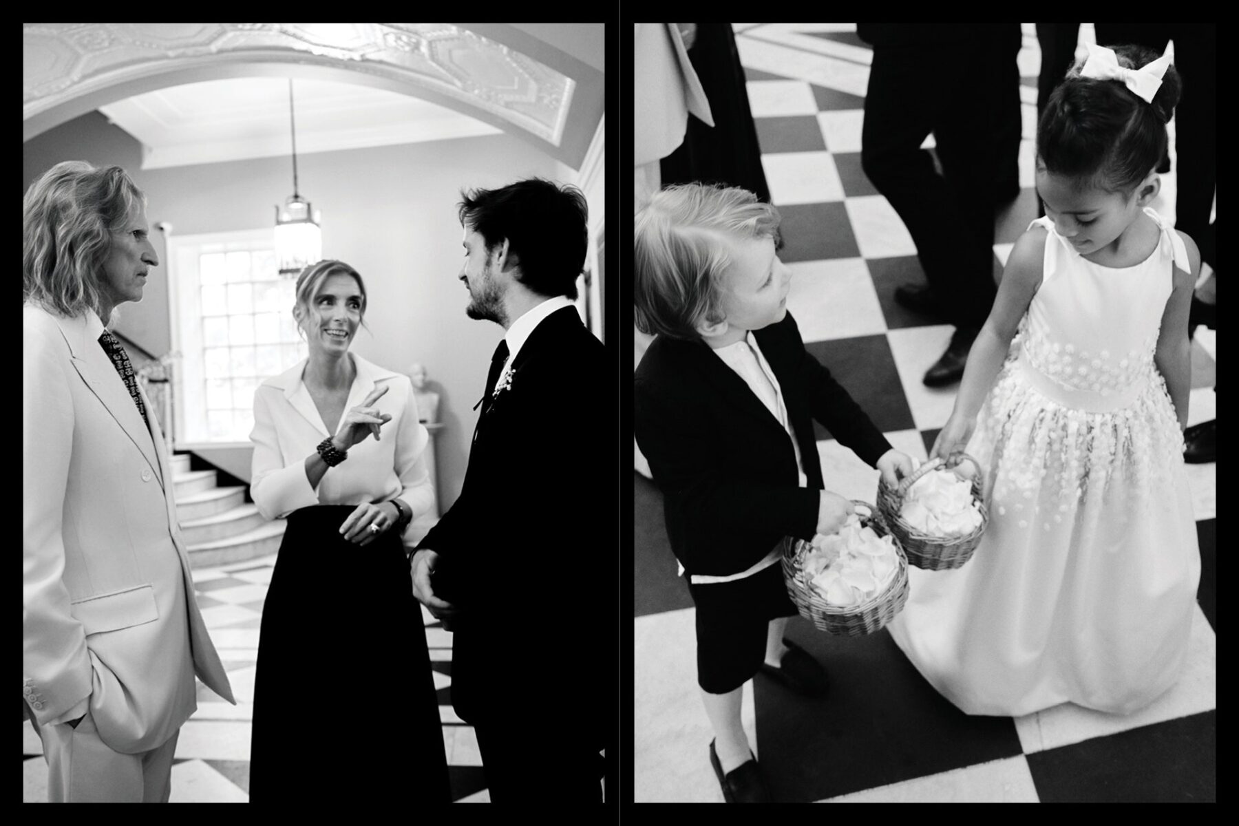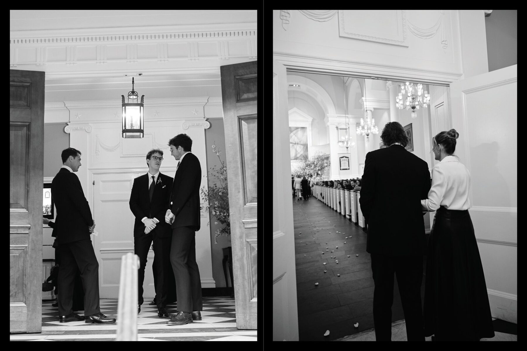 梳妝完畢後,新娘與婚禮團隊抵達上東區的All Souls教堂。「儀式首支樂曲選用《傲慢與偏見》(Keira Knightley與Mathew Macfayden主演版)的〈Dawn〉。」新娘透露,「一來我深愛這首樂曲,二來朋友們總調侃我會不會戴繫帶帽穿束腰胸衣走紅毯——他們都知道我多迷戀時代劇。這前奏響起肯定逗笑大家。」當 Nick Cave的〈Lavender Fields〉旋律響起時,她隨着伴娘們走向聖壇。「當我踏上紅毯看見Bernie,還有FlowerPsycho花藝師April Johnson打造的絕美花卉時,父親不得不悄聲提醒我記得呼吸。」Phoebe分享道,「那一刻美得令人窒息。」