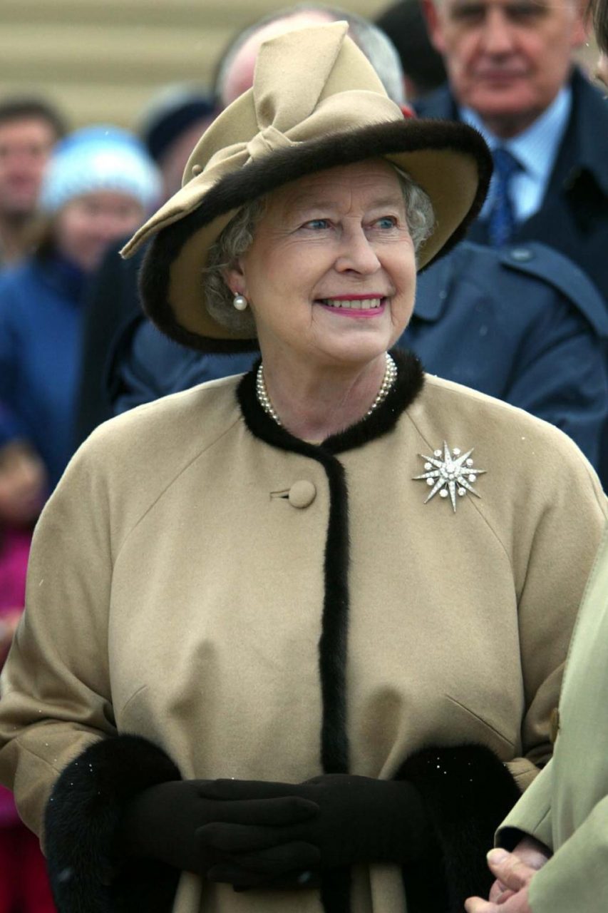 英女王在2002年前往加拿大的旅途中,佩上星狀別針(the Jardine Star Brooch)。