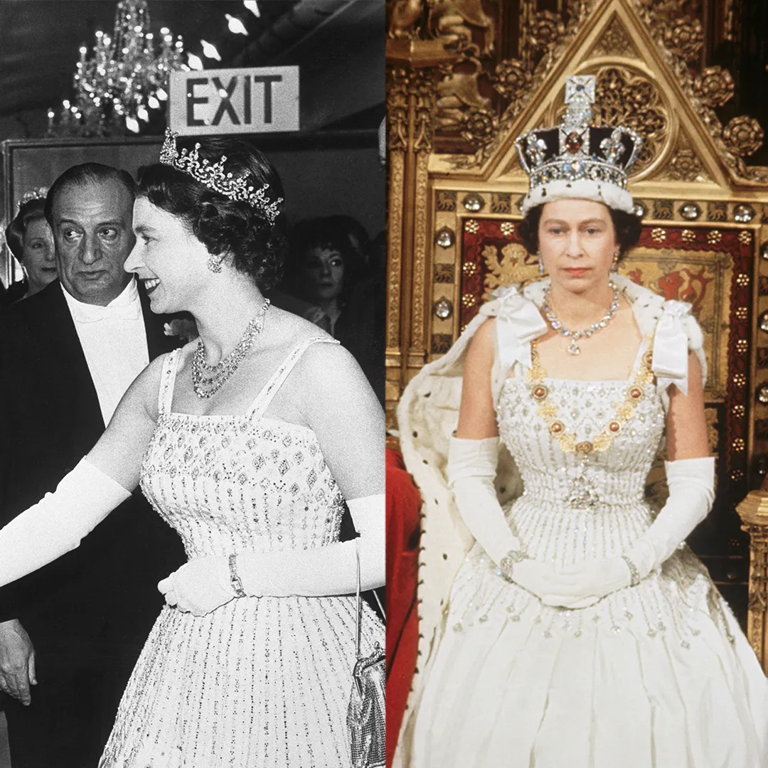 英女王在1962年《 Lawrence Of Arabia》首映式上穿著Norman Hartnell 的禮服出席,並在1966年的議會開幕式上再次穿着這套禮服。不過英女王這套象牙白色禮服首次亮相,則在1961年在羅馬的一次國宴上穿過。