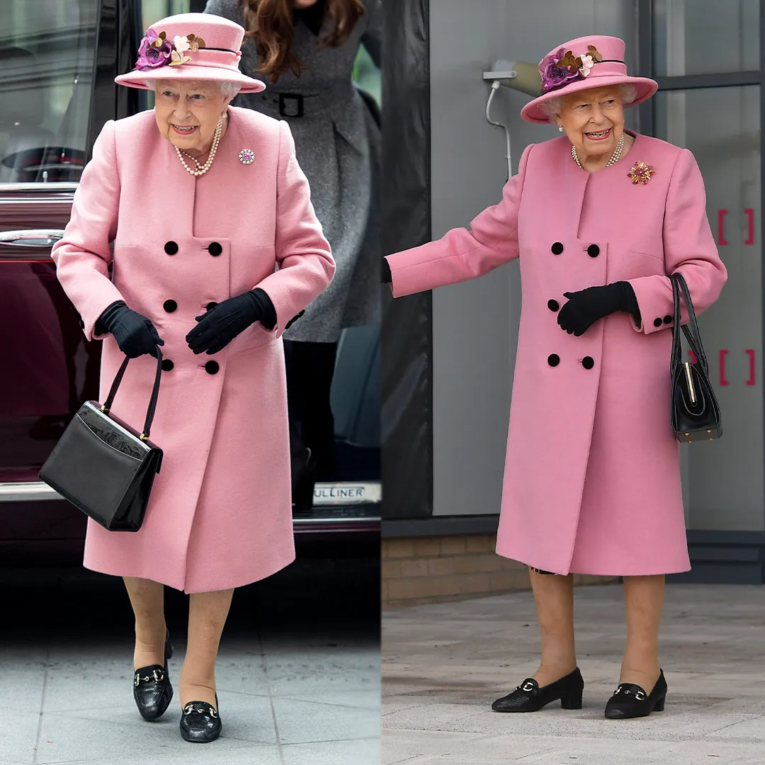 英女王在2019年與劍橋公爵夫人的聯合亮相中,穿上了這件由Stewart Parvin 設計的塵粉色大衣裙。一年後,她在與威廉王子訪問Salisbury 時重新穿上了相同的造型。