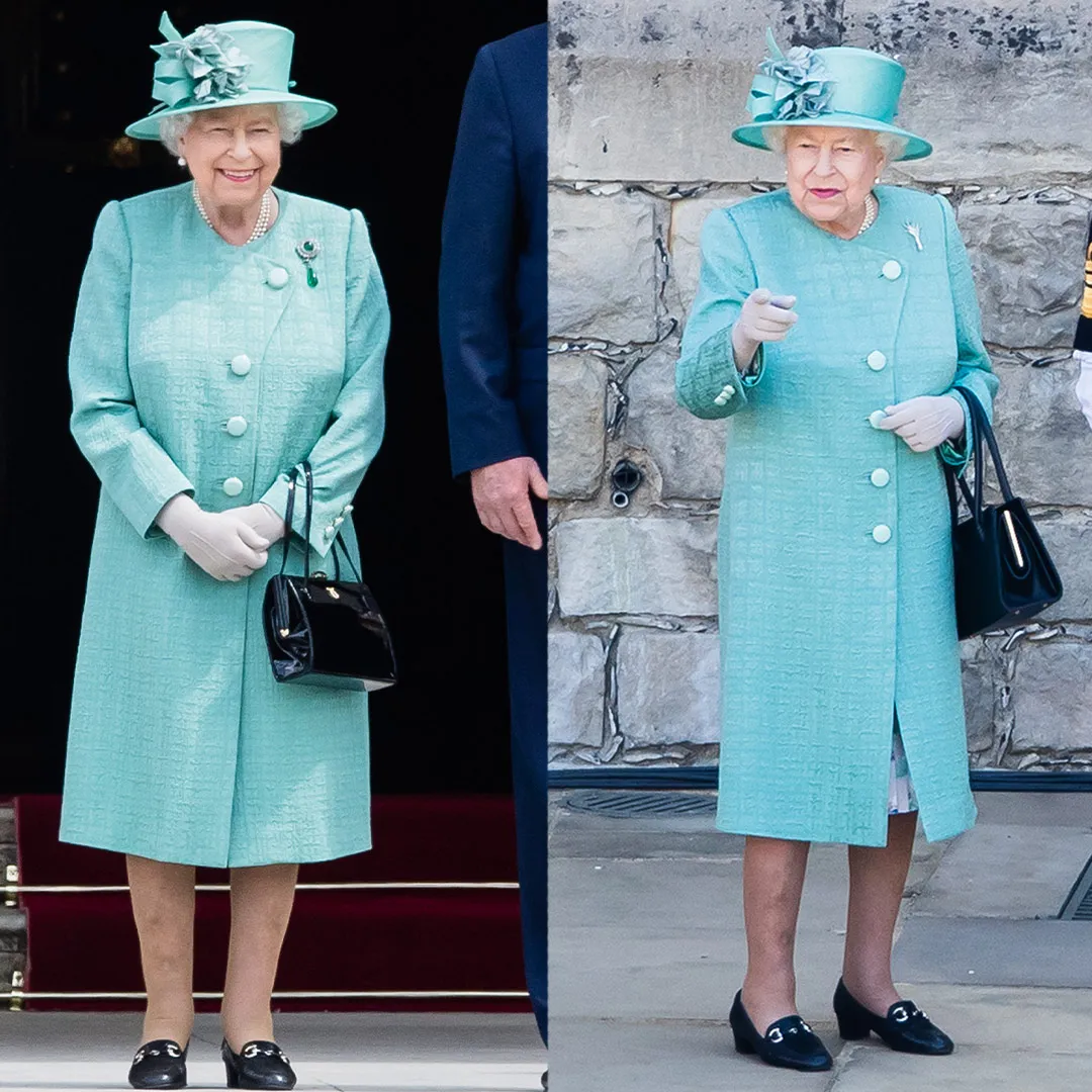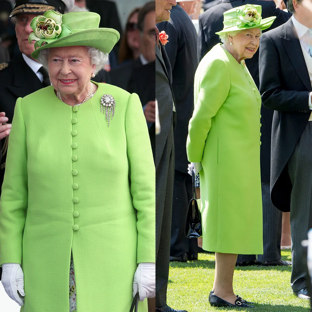 英女王一直都對鮮豔色彩搭配的高手,她在2014年紀念D-Day登陸70週年的活動中穿了這套青綠色的套裝,在3年後又在雅士谷賽馬場穿上了這套套裝。