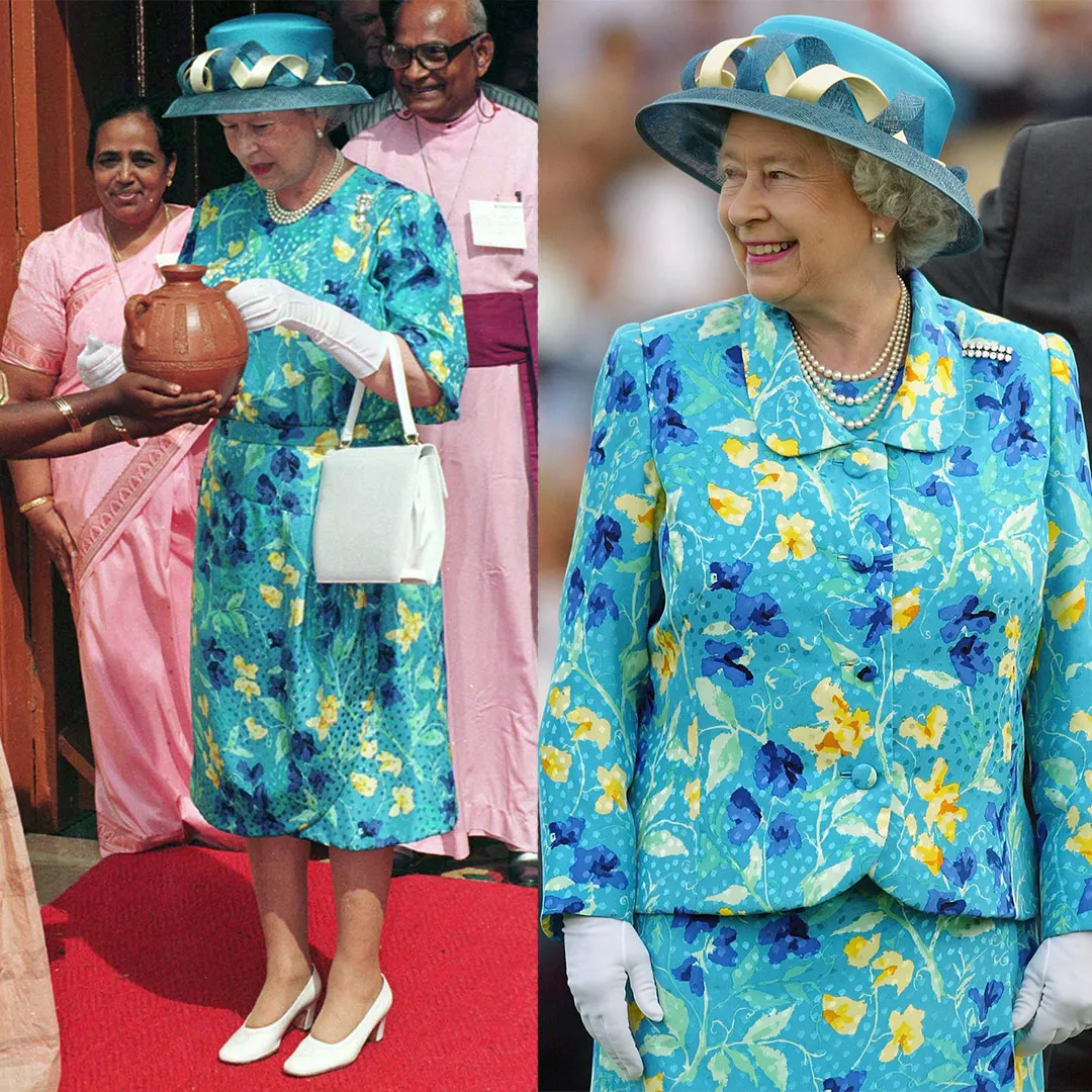 1997年,英女王在訪問印度時身著藍色碎花連衣裙,戴著同色調帽子。6年後,她又重新穿上了同樣的造型,並搭配了一件同色外套。