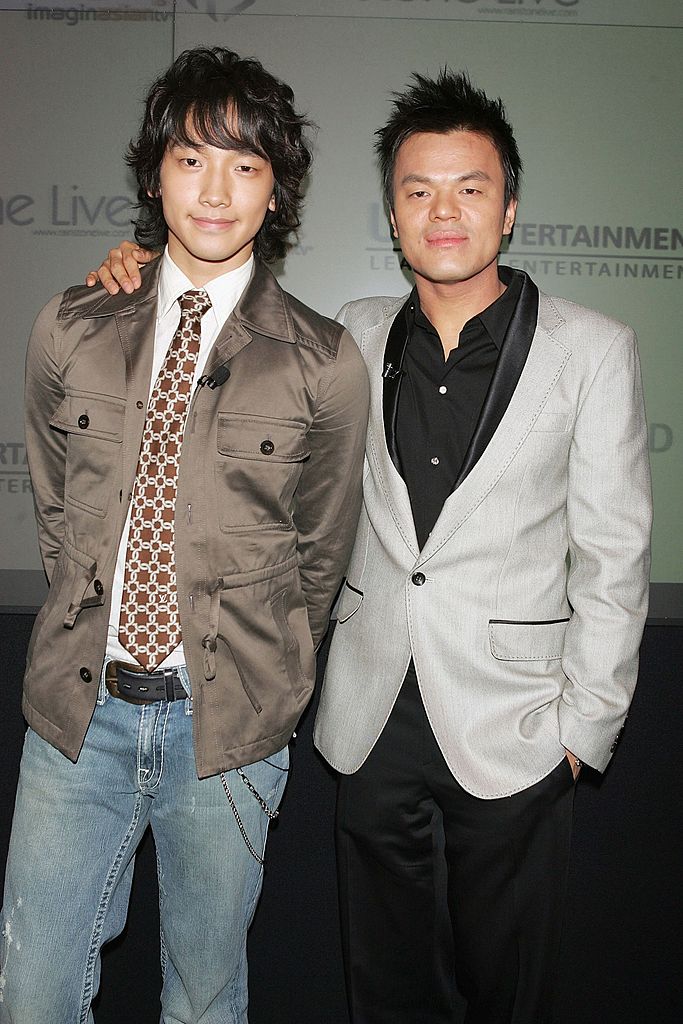 South Korean pop singer Rain (L) and producer JY Park pose for a photo during a press conference to discuss Rain's concert at Madison Square Garden February 1, 2006 in New York City.