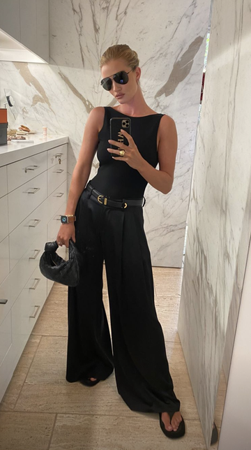 緊身衣是Huntington-Whiteley最愛的單品之一,搭配量身定制的褲及涼鞋,營造出秋季格調。