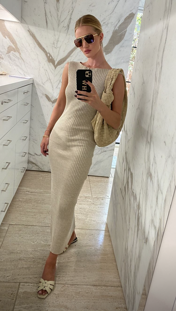 Rosie 穿上舒適的米色羅紋針織連身裙,延續她的簡約風格。