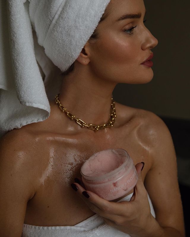 Rosie 究竟如何搭配毛巾出浴造型?當然是戴上一對來自 By Pariah 的長珍珠耳環。她第一次接觸到這個倫敦品牌的設計是在2019年,當時她穿着令人難以置信的 Foam 耳環,並由創辦人 Sophie Karg 贈送給她。