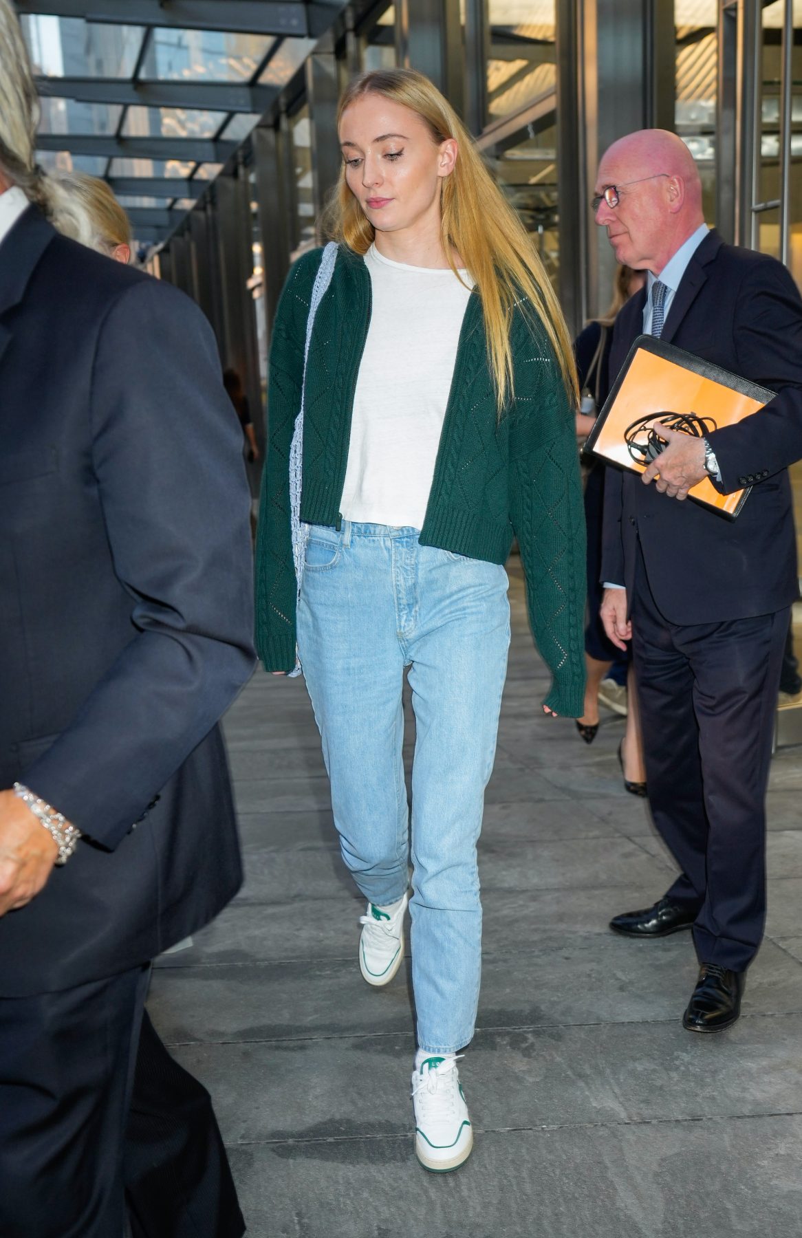 在Sophie Turner另一套相似造型中,她則將白色休閒褲更換成藍色直筒牛仔褲,選擇同色系丹寧帆布袋,綠白藍三色構既能營造清爽的休閒感,又能利用色塊搭配塑造優越的身材比例。