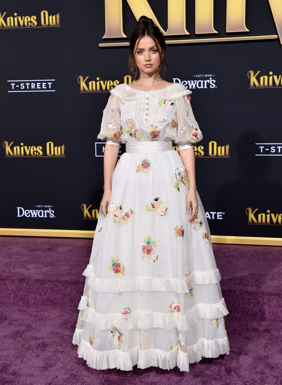 雖然性感已逐漸成為Ana de Armas形象的代名詞,但優雅的花卉長裙與她的娃娃臉稚嫩氣質同樣十分相襯,例如2019年《神探白朗:福比利大宅謀殺案》洛杉磯首映禮上,她以Chanel白色繡花高級訂製禮服亮相紅地毯,復古衣領和多層薄紗設計都為她營造出可愛感。同樣在2017年《銀翼殺手2049》(Blade Runner 2049)東京首映禮上, Giambattista Valli 2017春季系列高領碎花長裙也襯托出Ana de Armas的女神仙氣,讓她笑起來時更猶如一位年輕少女。而近日《殺神John Wick外傳:芭蕾殺姬》的首映紅地毯上,她以一套黑白抹胸禮服,裙擺綴滿花卉形態,展現優雅姿態,但有別於以往的少女感碎花裙,更添成熟與力量感。