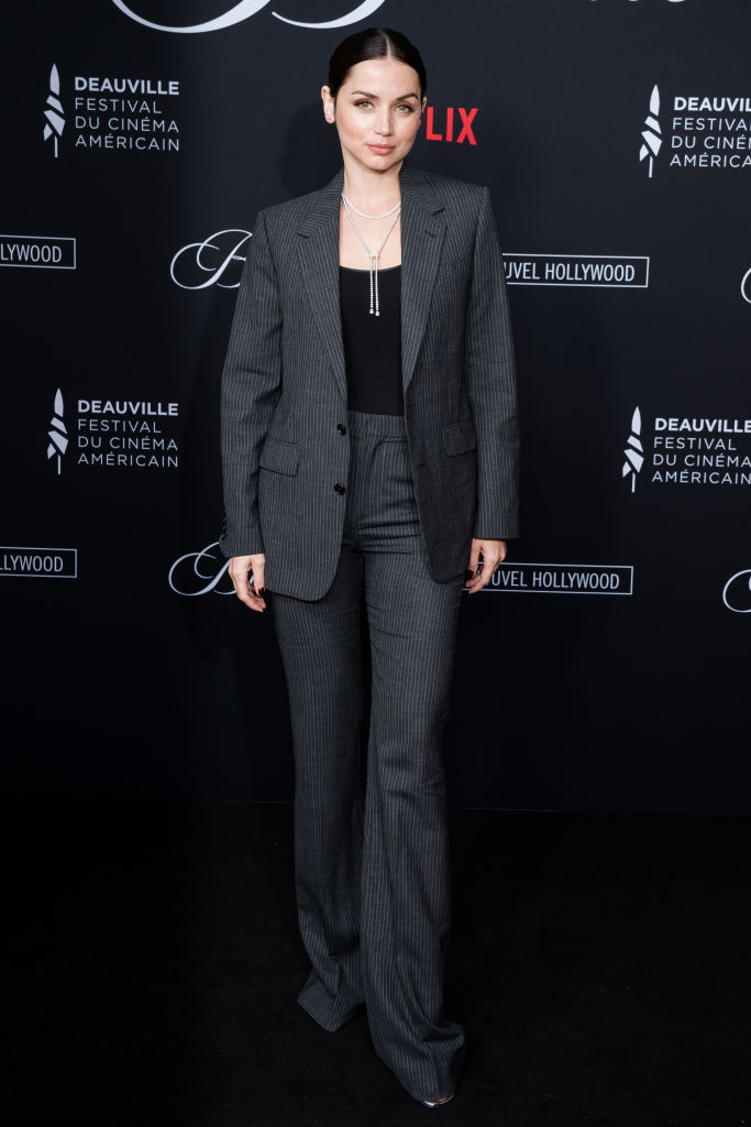 Ana de Armas在紅地毯上除了性感造型,也不乏精緻的西裝套裝造型,展現幹練俐落風格。而曾揚言邦女郎不應被視作為占士邦的附屬品的她,早在2019年《神探白朗:福比利大宅謀殺案》(Knives Out)倫敦首映禮上展現出「女占士邦」的一面,當時她一身Alexandre Vauthier高級訂製西裝在雲雲性感造型之中突出,甚有中性剛陽的氣息,領結及襟花亦令造型格外醒神。
