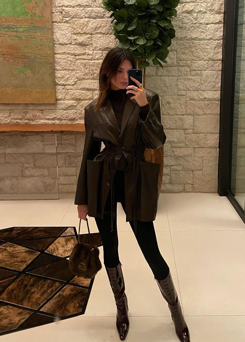 April 26, 2021 Kendall Jenner 身穿 The Frankie Shop 大衣,Cult Naked 長褲,穿上 The Row 靴;背上 Little Liffner 手袋。
