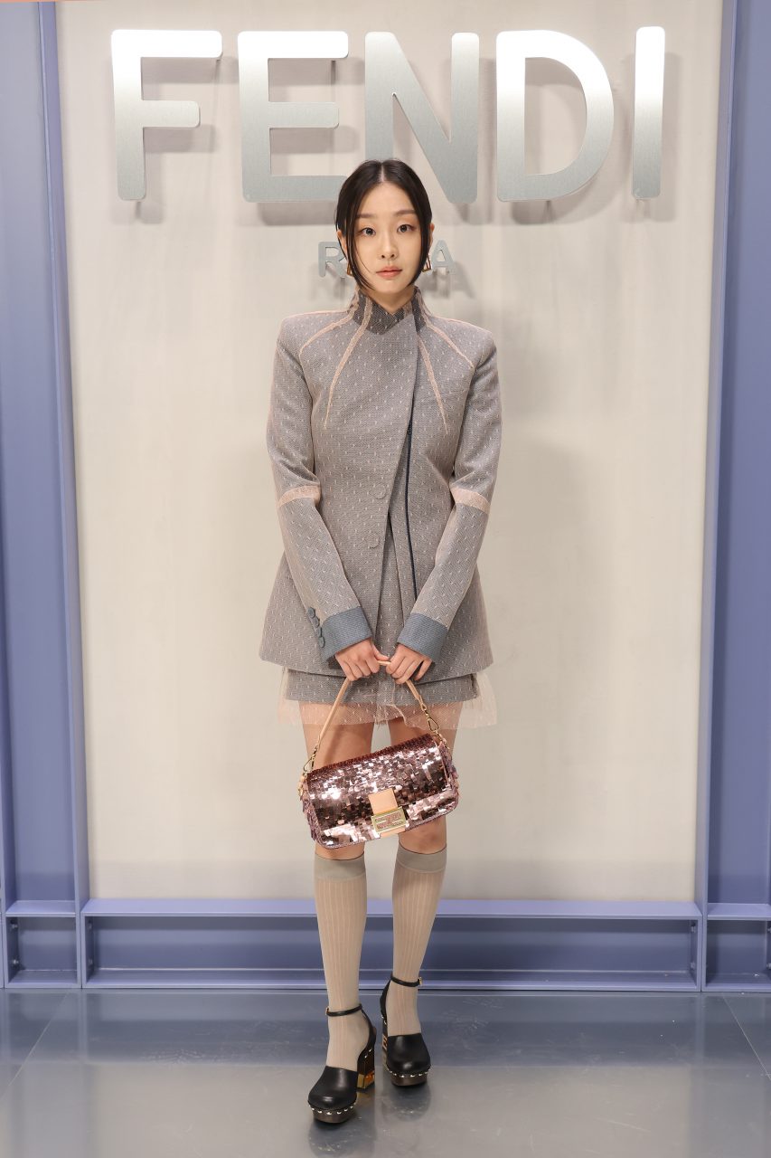 而在另一套Fendi穿搭中,金多美大膽選用粉色亮片手袋和高踭鞋點亮整套造型,配搭同色系灰色長襪營造鄰家少女的感覺,粉色蕾絲面料覆蓋於灰色西裝之上,匠心獨運,巧藏新意,呈現剛柔並濟的女性特質。