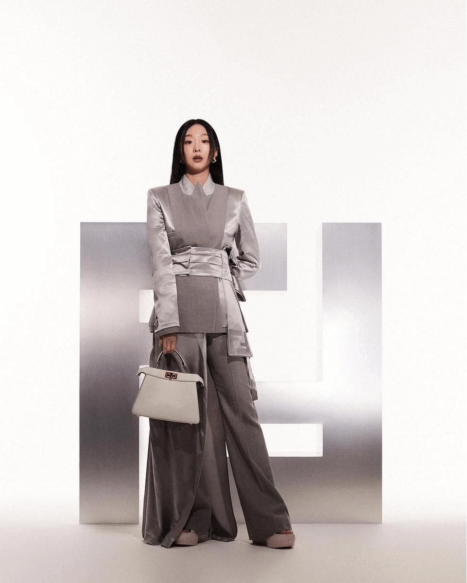 作為Fendi韓國地區大使的金多美,今年2月出席Fendi「Palazzo Fendi Seoul」旗艦店活動,她以銀灰色套裝出席,西裝面料與緞面材質優雅並存,標誌性的俐落黑色公主切髮型將其率性瀟灑的一面展露出來。