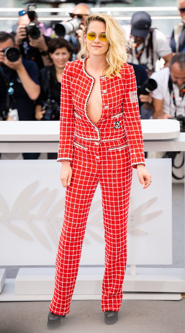 Kristen Stewart 在 2022 康城影展身穿 Chanel 2023 度假系列紅色套裝。