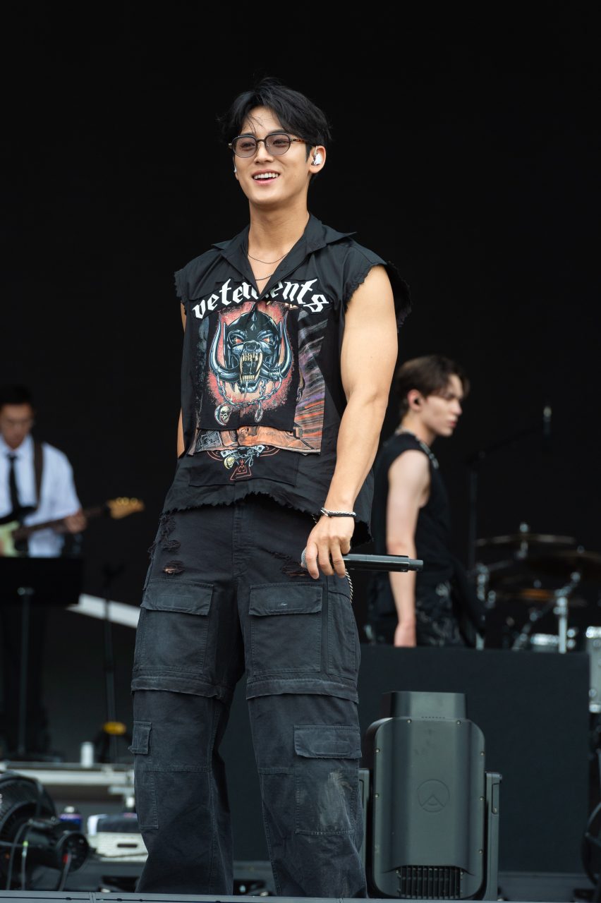 GLASTONBURY, ENGLAND - JUNE 28: Mingyu of Seventeen performs during day three of Glastonbury Festival 2024 at Worthy Farm, Pilton on June 28, 2024 in Glastonbury, England. Founded by Michael Eavis in 1970, Glastonbury Festival features around 3,000 performances across over 80 stages. Renowned for its vibrant atmosphere and iconic Pyramid Stage, the festival offers a diverse lineup of music and arts, embodying a spirit of community, creativity, and environmental consciousness. (Photo by Joseph Okpako/WireImage)