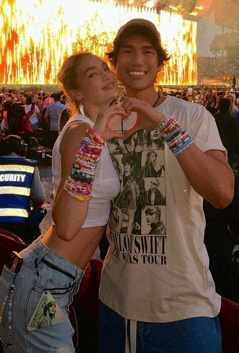 Gigi Hadid 與她的化妝師兼好友 Patrick Ta 一同觀看演唱會,色彩繽紛的「友誼手鍊」罕有地在這位時尚名模身上出現,與好友以心形手勢拍下友誼合照!Gigi 還特別以流蘇閃石長裙以配合 Taylor 的演唱會造型,而其好友則直接穿上演唱會紀念 T 恤。