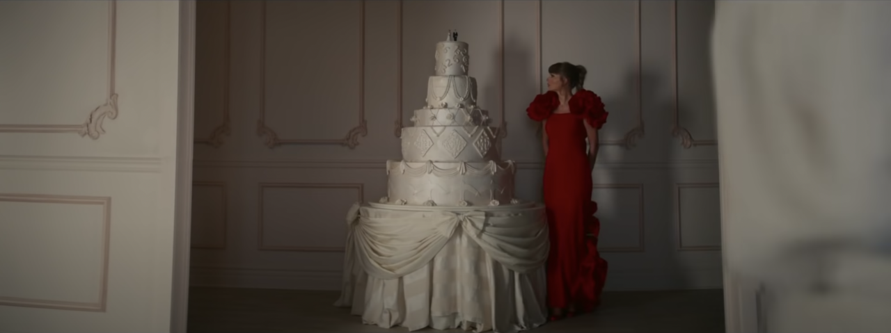期後亦出現 Taylor Swift 在婚宴上破壞結婚蛋糕的一幕,當時她身穿的正是 Tadashi Shoji 2020秋季系列的紅色玫瑰袖禮服,MV 中大量的玫瑰細節取靈感自著名文學作品《愛麗絲夢遊仙境》(Alice’s Adventures in Wonderland),造型配搭 Anabela Chan 首飾及 Christian Louboutin 高跟鞋,俏皮卻不失高貴。