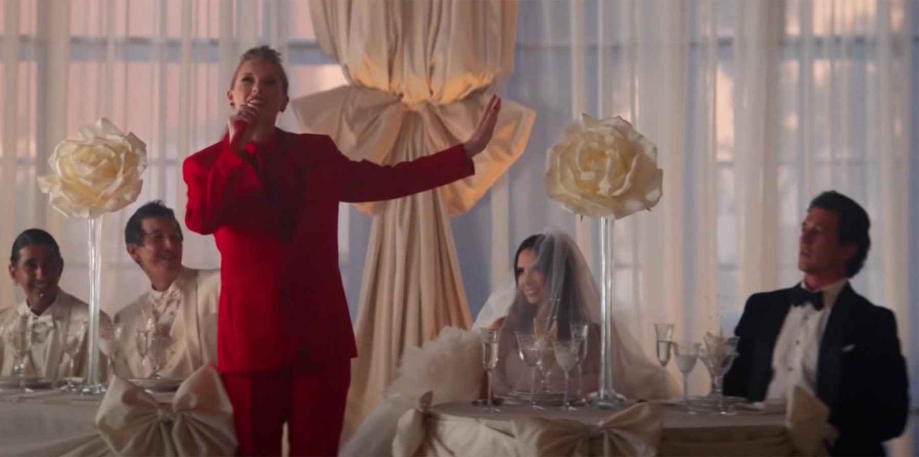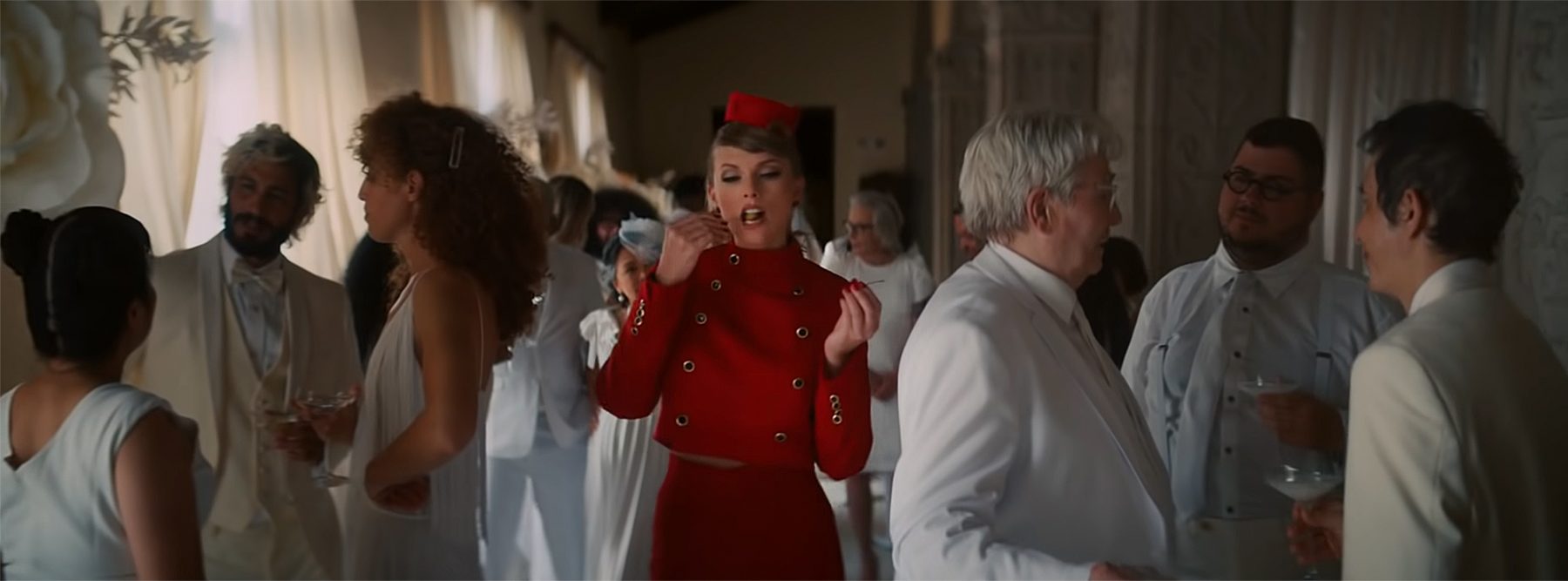 此外 Taylor Swift 亦穿上3套訂製禮服,分別扮演侍應、伴郎及花童,以鮮明的全紅色造型再次搶盡婚禮中的焦點,並成為「前男友」心中揮之不去的記憶。
