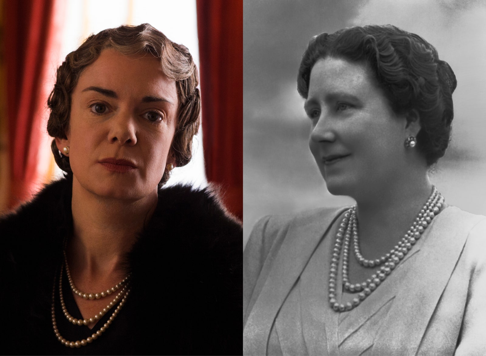 (L-R)英國演員 Victoria Hamilton 在《王冠 The Crown》中飾演的伊利沙伯皇太后;人物原型