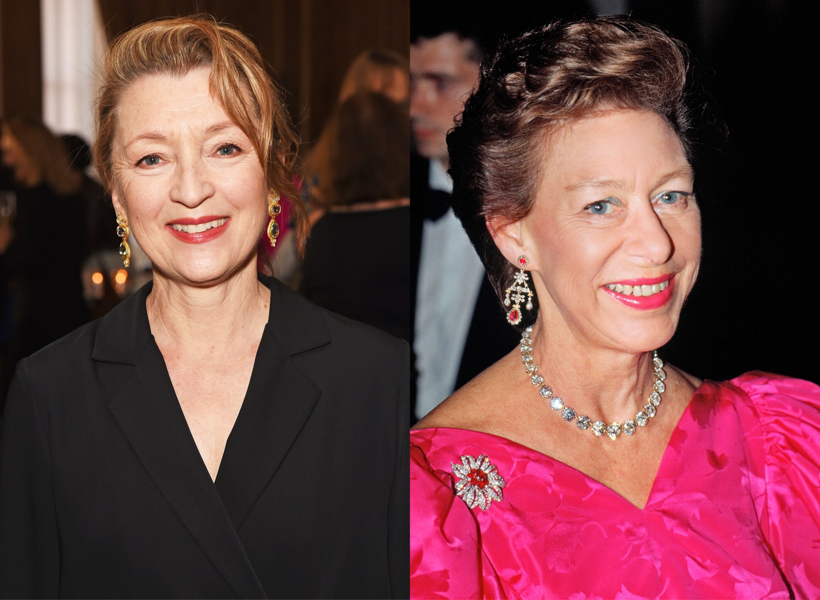 (L-R)英國演員 Lesley Manville 在《王冠 The Crown》中飾演的老年時期的瑪嘉烈公主;人物原型