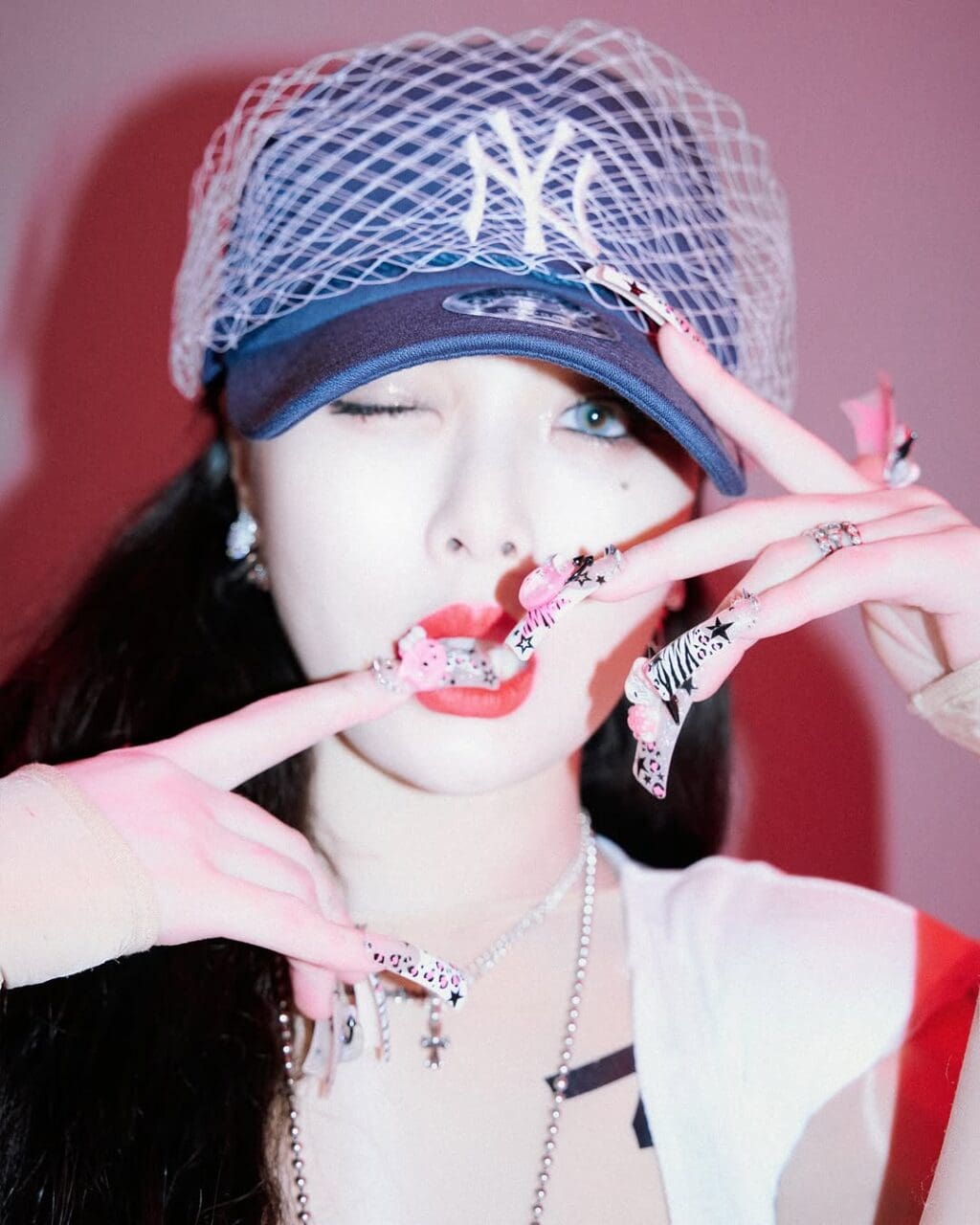 在充滿玩味性的美甲,泫雅再配搭經典的紅唇妝,並戴上淺藍色的隱形眼鏡示人,為她的眼神增添了一抹神秘與清新,與整體造型相得益彰,充分展露出她標誌性的「女王」形象