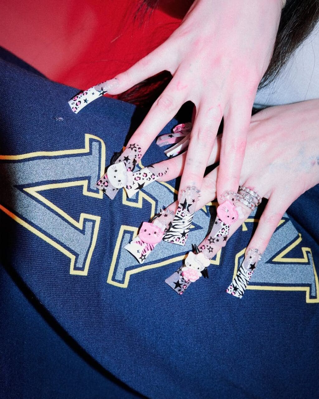 泫雅釋出的照片,她在《Mrs. Nail》中打破傳統黑白配色的界限,改為以黑粉色的豹紋為主,還巧妙地加入了斑馬理,整體造型既前衛又具青春氣息,完美捕捉了當代流行文化的精髓。而每個指甲上都裝飾著不同的元素,如卡通角色、星星等,形成了豐富的視覺效果。