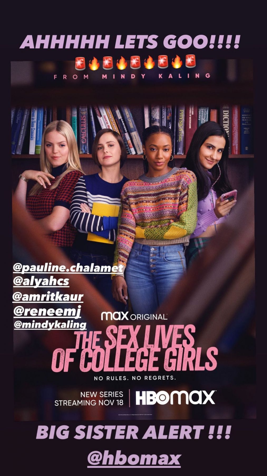 Timothée Chalamet 去年早已在自己的Instagram上分享姊姊 Pauline Chalamet 有份演出 HBO Max 喜劇系列《The Sex Lives of College Girls》,還在動態上貼上恭喜的 emoji,十分自豪。相隔一年之後,《The Sex Lives of College Girls》正式上架,Timothée Chalamet 再次支持姊姊,還在個人動態上留下「 BIG SISTER ALERT」字句,以自己人氣希望粉絲們一同欣賞這作品。