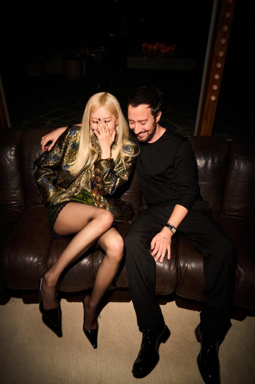 來自全球知名 K-pop 女團 BLACKPINK 的 Rosé 是當晚首批抵達的嘉賓之一。她身穿一件色彩鮮豔的Saint Laurent 錦緞外套,搭配綠色迷你裙和蕾絲緊身衣,與經紀人團隊漫步於宅邸寬敞的門廳,並駐足欣賞這座豪宅最具特色的設計——一根巨大的中央柱體支撐著層層木質樑架的同心圓形結構,彷彿置身於一顆巨型蘑菇之下。隨後,她與Saint Laurent 創意總監 Anthony Vaccarello 熱情打招呼。