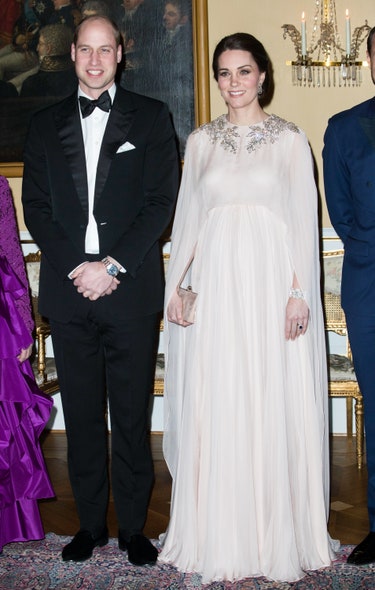 懷孕時的 Kate Middleton 在奧斯陸舉行的一場官方晚間活動中,選擇了一件由Alexander McQueen 設計的閃閃發光的刺繡連衣裙。