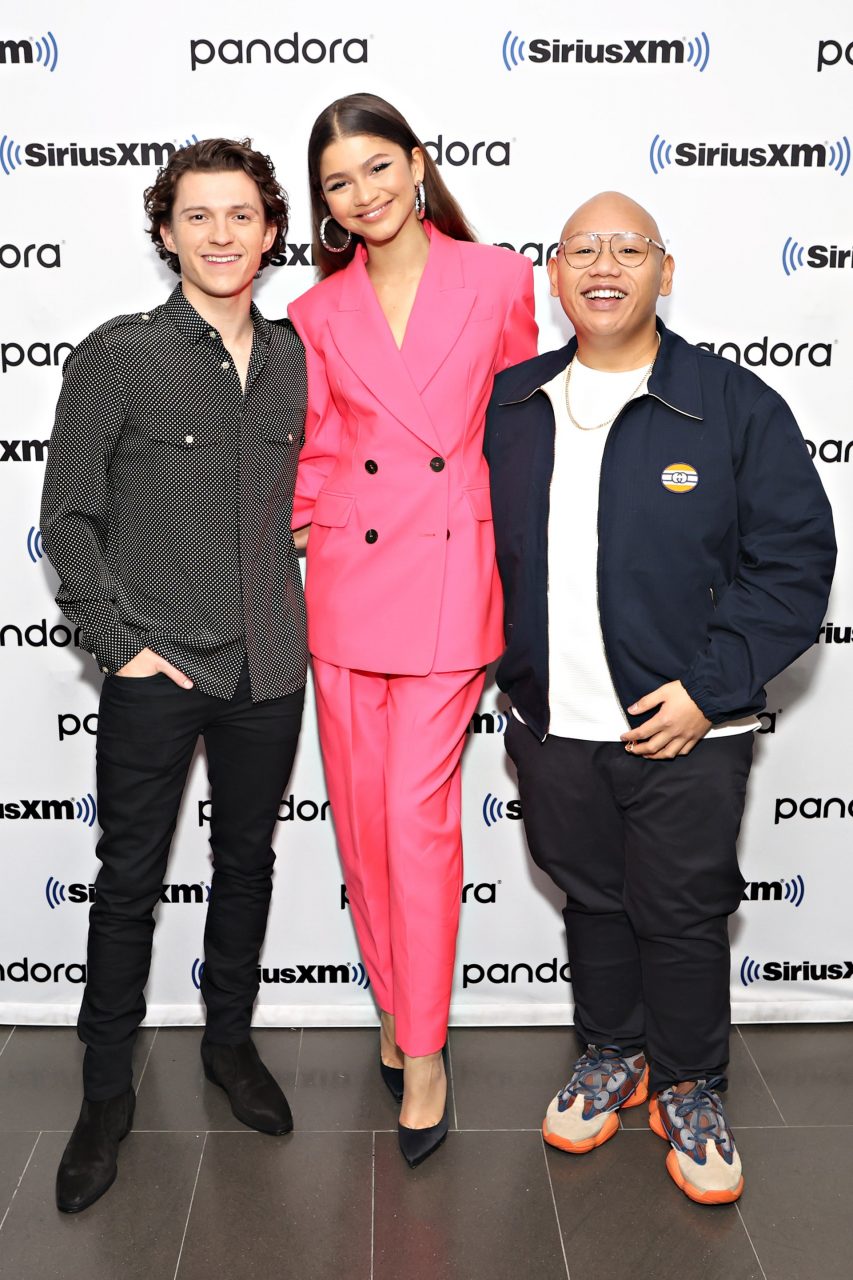 在紐約市的 Sirius XM 市政廳,Zendaya 穿著 Alexander McQueen 的粉紅色套裝和 Christian Louboutin 高跟鞋。 湯姆選擇了一件灰色鈕扣恤衫、時髦的黑色牛仔褲和黑色皮鞋。