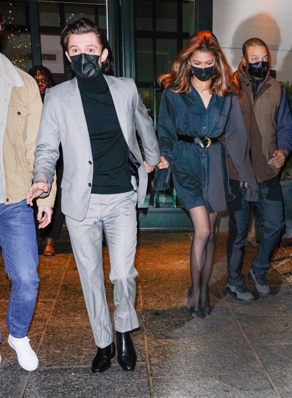 2022 年 2 月 16 日 這對情侶被發現在紐約市一家時尚酒店門外。Tom 身穿黑色高領灰色西裝,而 Zendaya 則穿著黑色襯衫裙、Wolford 緊身褲和 Christian Louboutin 高跟鞋,保持經典。