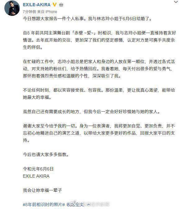 經常被問到感情狀況的林志玲今日突然公佈與EXILE放浪兄弟的37歲成員AKIRA結婚!