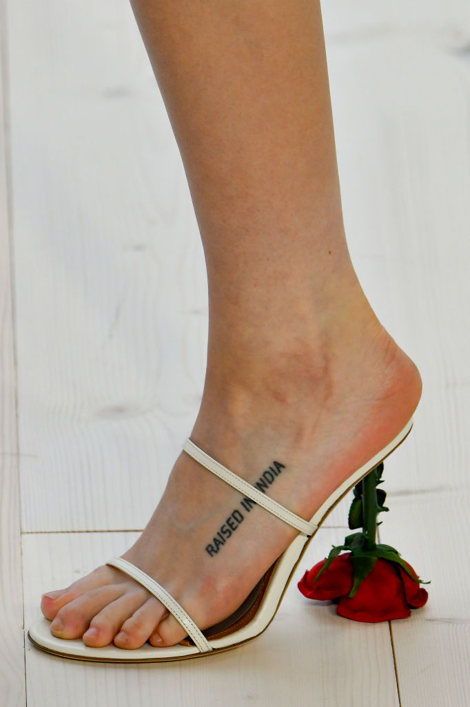 2022春夏女裝系列以文藝復興時期為靈感,借鑑矯飾主義帶來的不和諧感覺。模特兒腳上的高踭鞋飾有玫瑰、肥皂、指甲油、蠟燭,還有破裂的雞蛋,為造型帶來一絲幽默感。