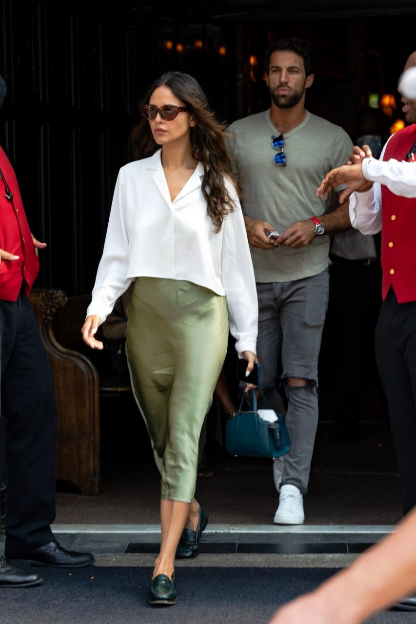墨西哥女演員 Eiza Gónzalez  展示了一種極具春天氣息的風格配方,她用類似色調的緞面效果裙子和中長款搭配流暢的紋理短款襯衫來保護綠色軟皮鞋。