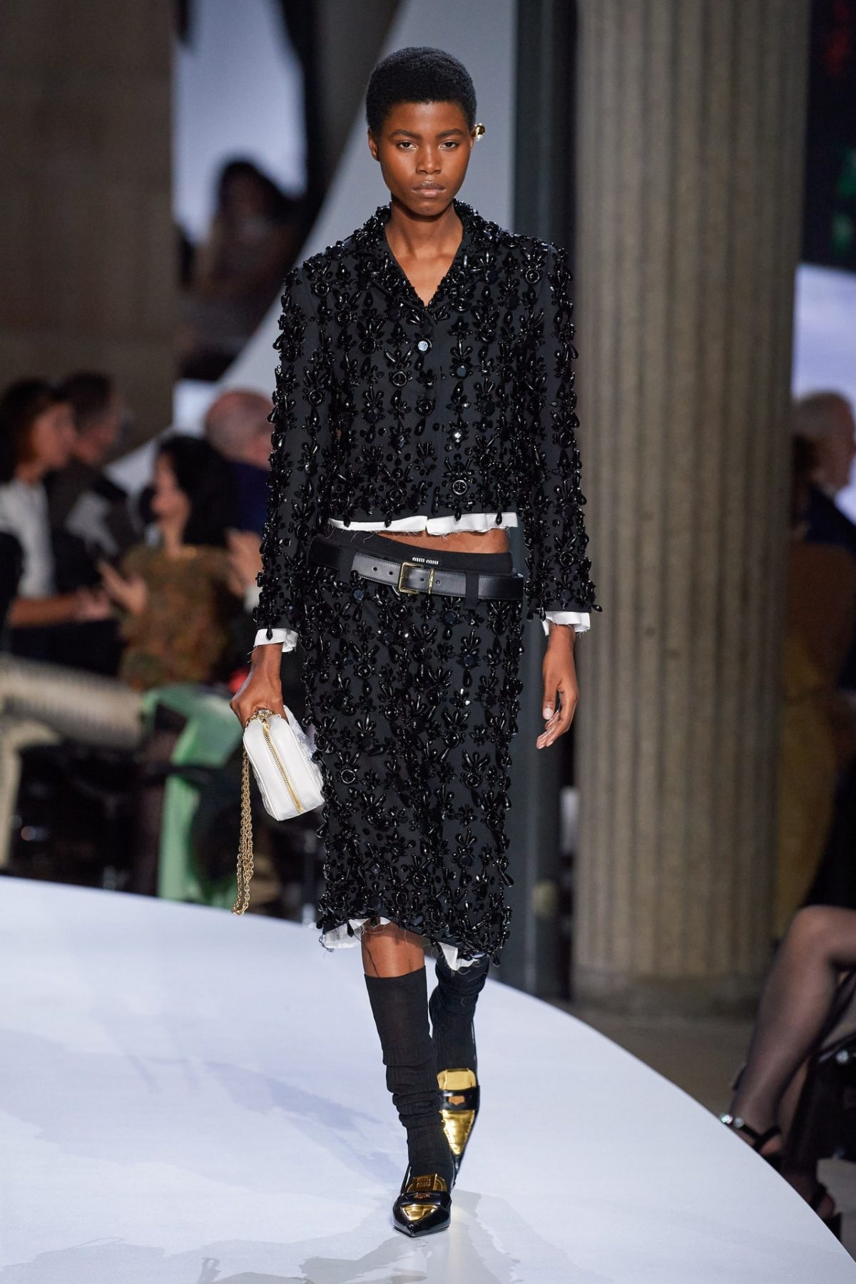 Miu Miu  2022 年春季選擇了金色三角鞋頭 Loafers 。品牌同時展現應用水鑽的趨勢,推出了一套由短版夾克和中長裙搭配黑色襪子組成的兩件套裝。