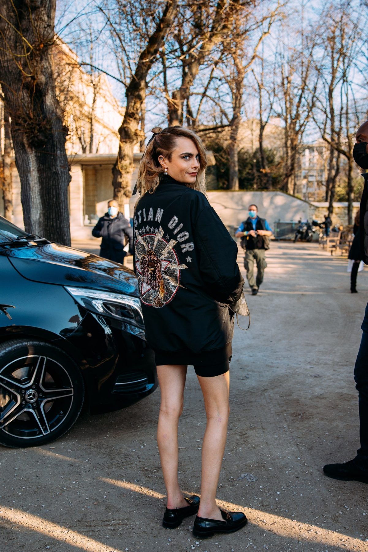 超模 Cara Delevingne 以學院風造型出席了 Christian Dior 高級定制時裝秀。 經典的 Lafers 配搭短版黑色單車緊身衣、帶領帶的白襯衫和帶有不拘一格印花的夾克相結合。