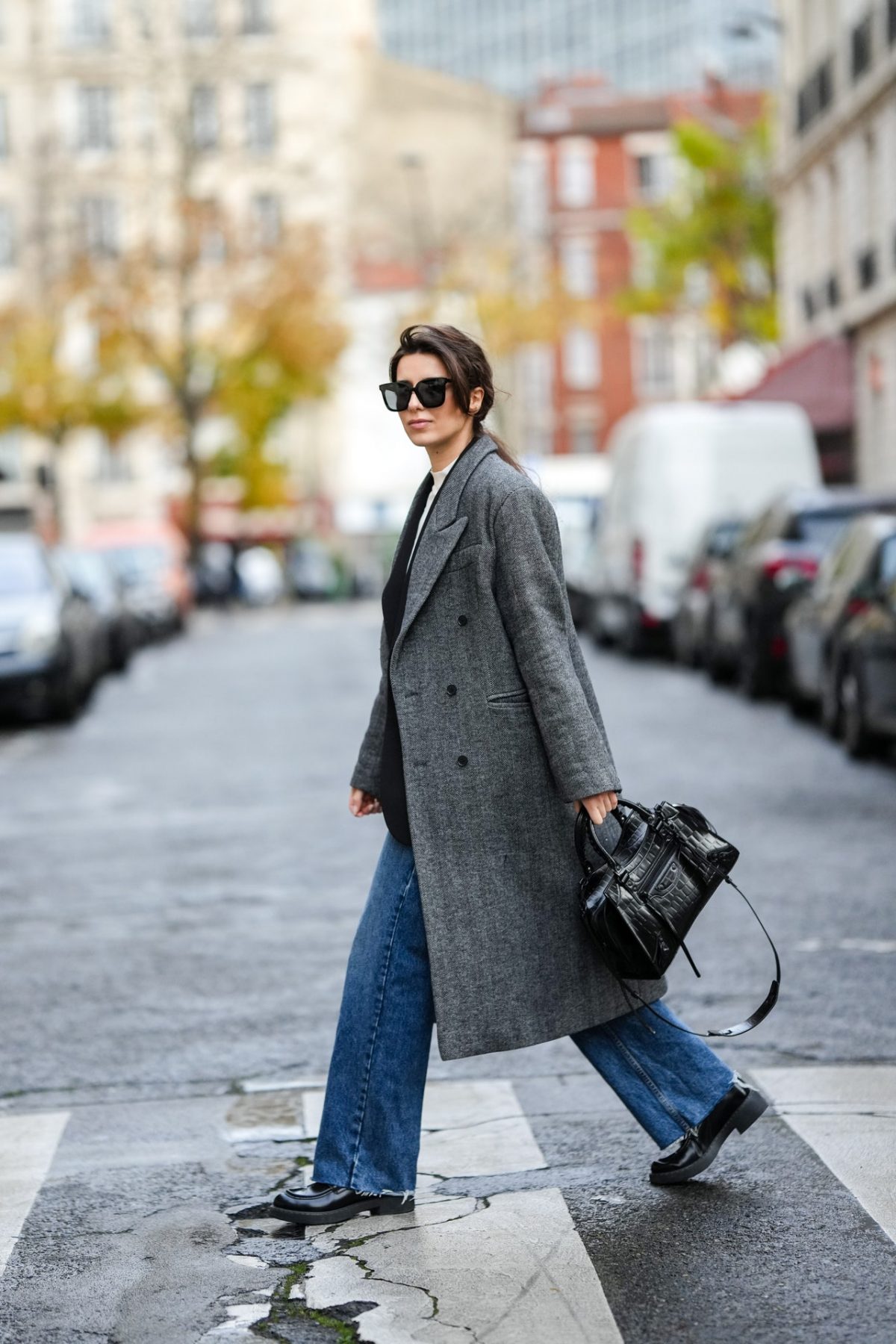 長款大衣是冬季必備的單品,這位街頭風格的女士證實了這一點。 在這個場合,我們看到軟皮鞋搭配闊腿牛仔褲和灰色中長外套。