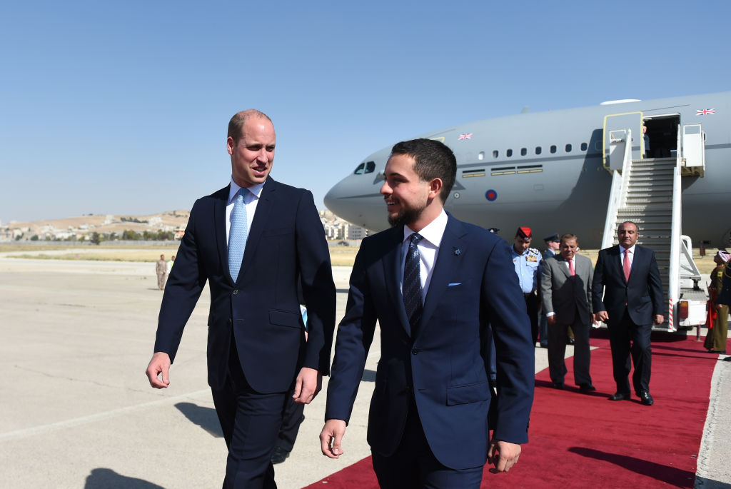 AMMAN, JORDAN - JUNE 24: Prince William, Duke of Cambridge is greeted by the Crown Prince Hussein of Jordan (R) after arriving at Marka Airport at the start of his Middle East tour on June 24, 2018 Amman, Jordan. Prince William's five-day tour of the region is his most high-profile foreign trip and the first official visit to Israel and the Occupied Palestinian Territories by a member of the monarchy on behalf of the Government. (Photo by Joe Giddens-Pool/Getty Images)