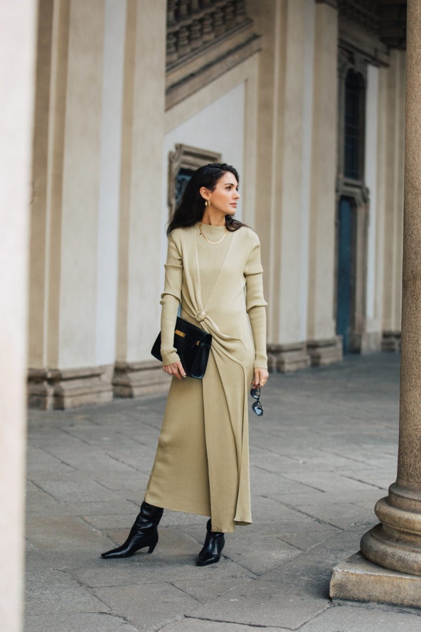 單色又顯氣質,白色連衣裙搭配黑色短靴後,就變成了有圖形設計感的宣言。