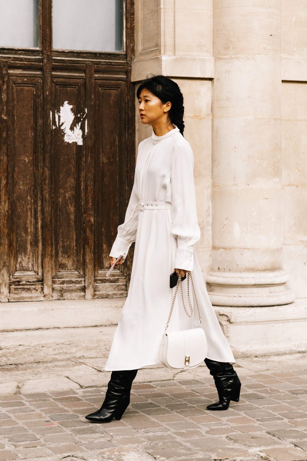 單色又顯氣質,白色連衣裙搭配黑色短靴後,就變成了有圖形設計感的宣言。