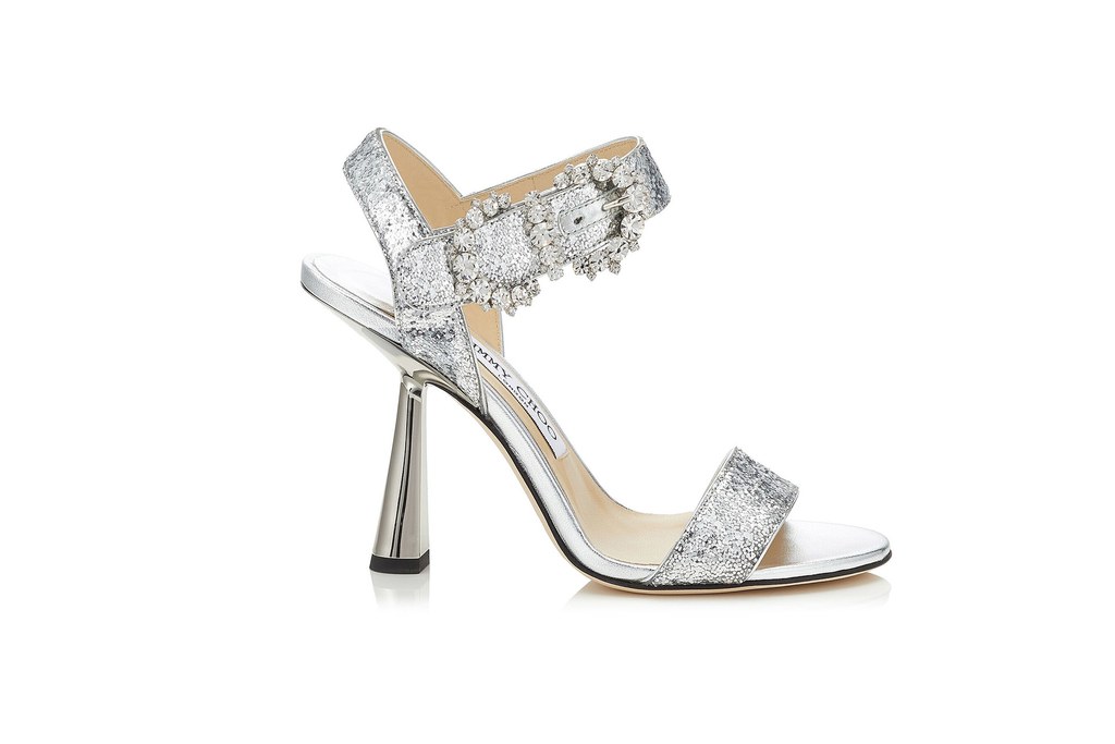 Silver fabric sandals with jewelled buckle, £795, available at Jimmychoo.com.