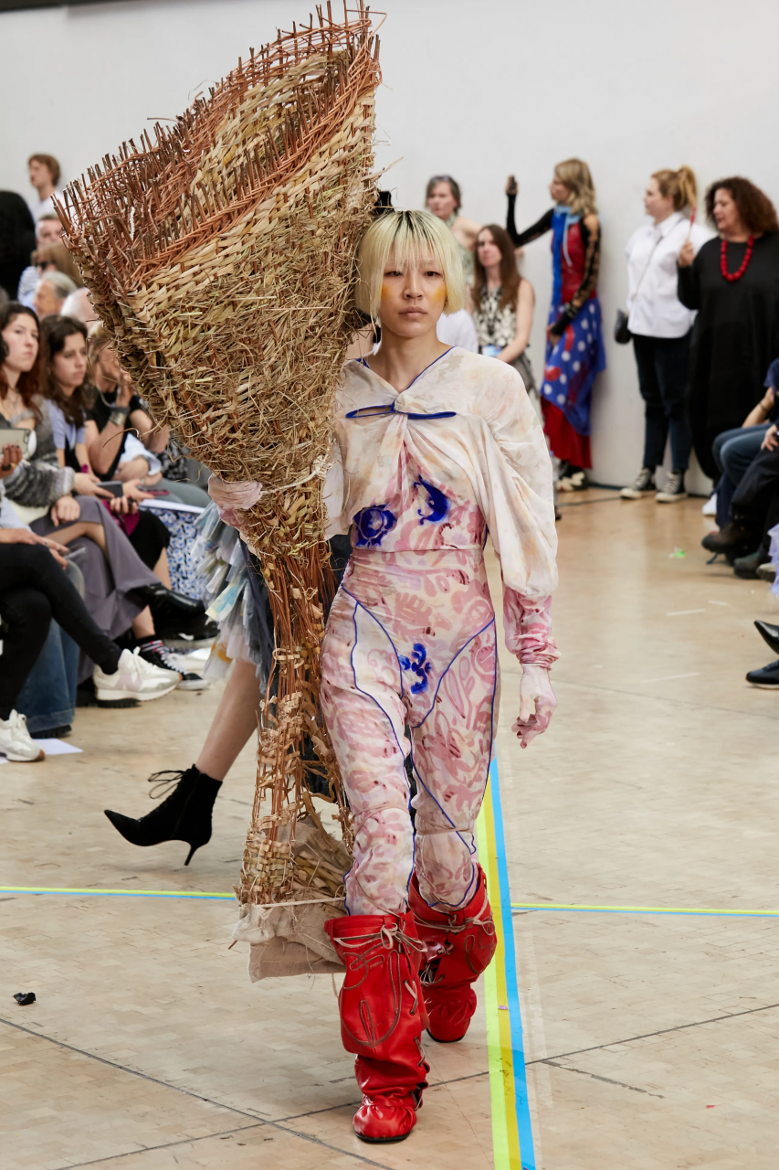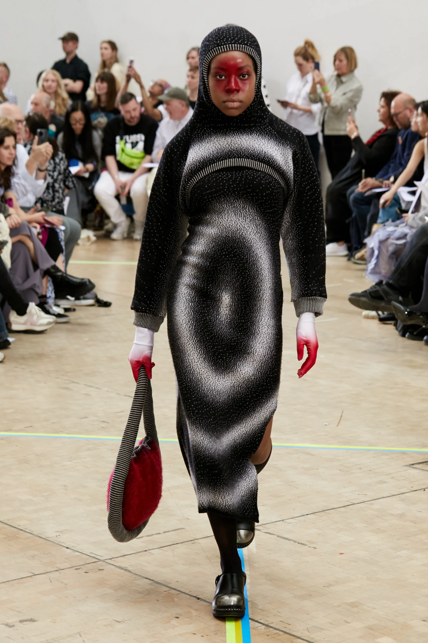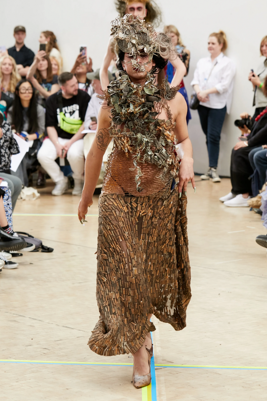 Faye Simister 的光學幻覺印花針織、Inok Chung 超現實主義拼接男裝,還有讓人目不轉睛的 Tilda Fuller 立體印花,以及 TJ Finley 以煙頭編織的網狀服裝,自帶強烈的信息元素。