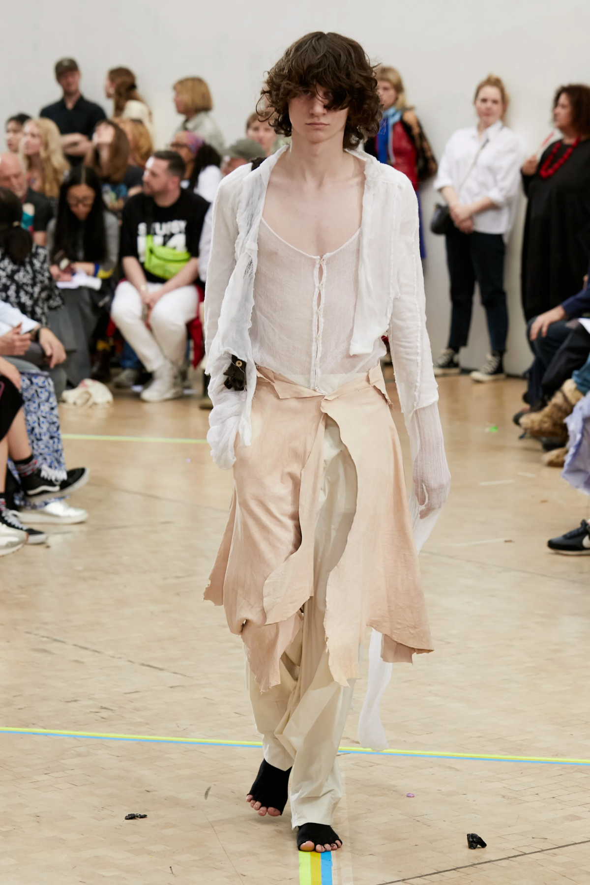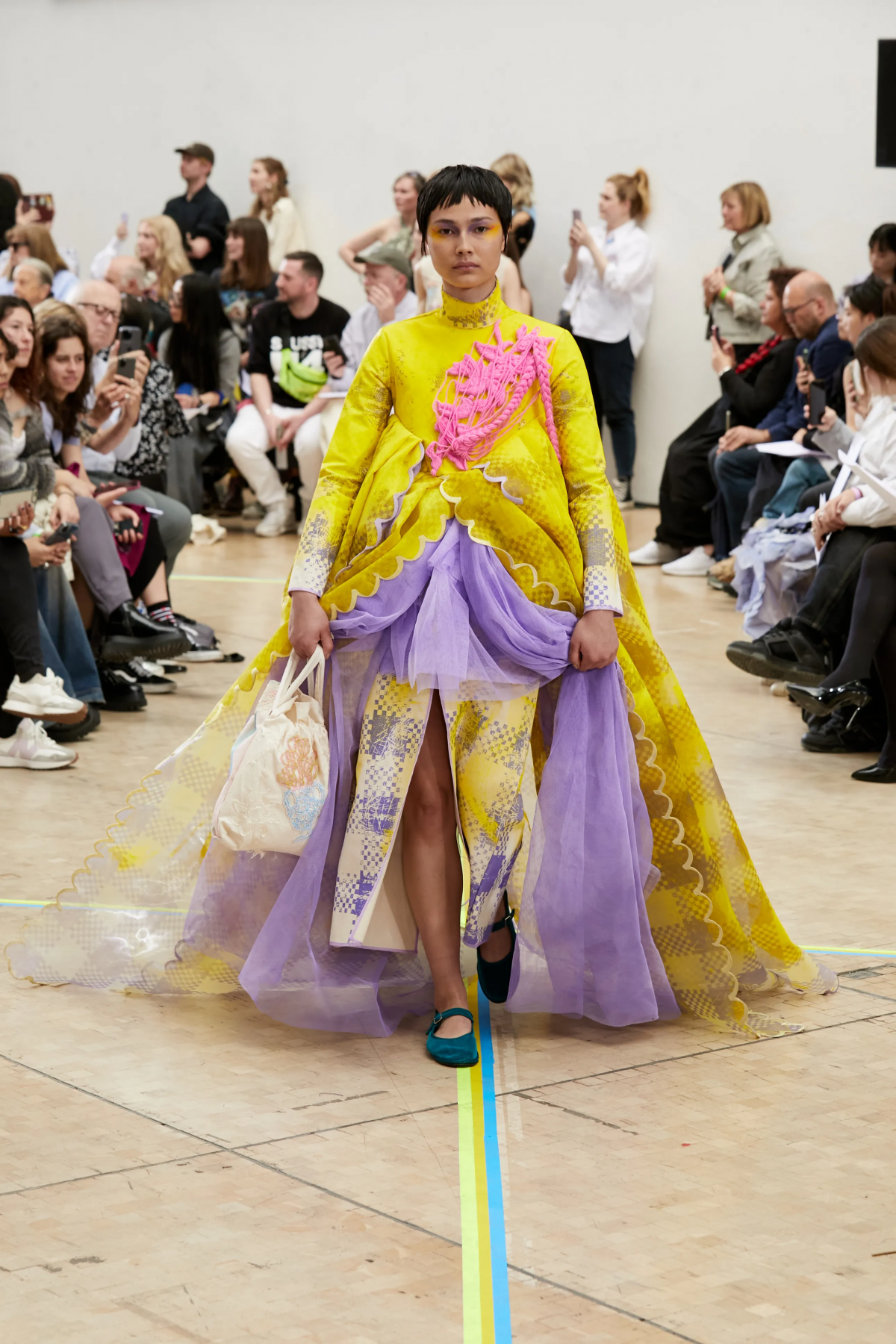 這概念都先後被 Maison Margiela 、三宅一生 Issey Miyake 發明的 A-POC (A piece of Clothes) 採用過,同工異曲的製衣概念都是透過減少裁剪而減低布料的浪費。而 Eden Tan 也重塑一卷布料的技術開發,「目的是讓眼睛相信它所看見的不僅僅是一卷布料。」極具舞台效果的超長裙襬,更無疑地展示出 Eden Tan 將借來的布料如何「從創造到廢棄、再從廢棄被重新使用和創造出不一樣的旅程。」