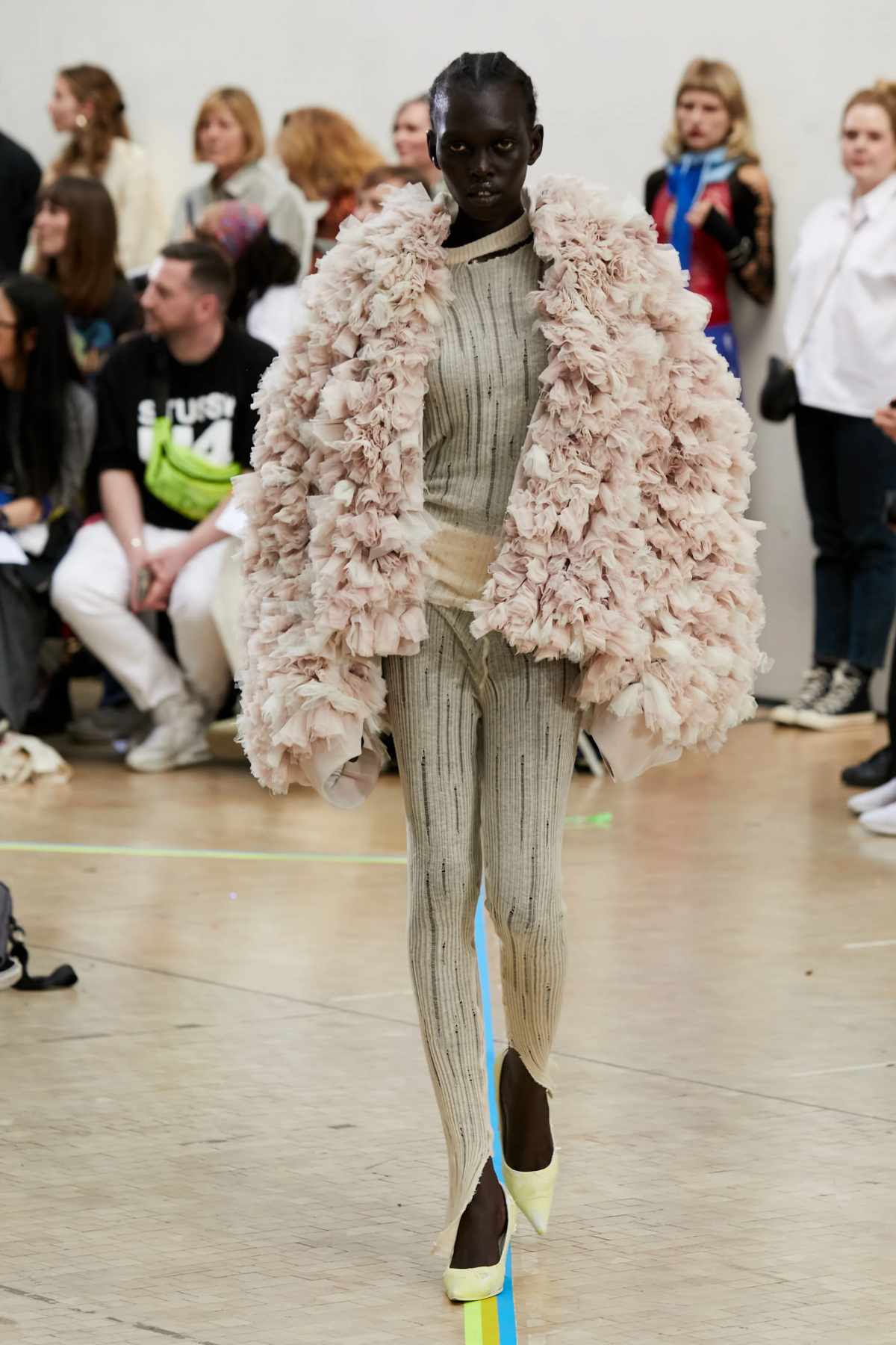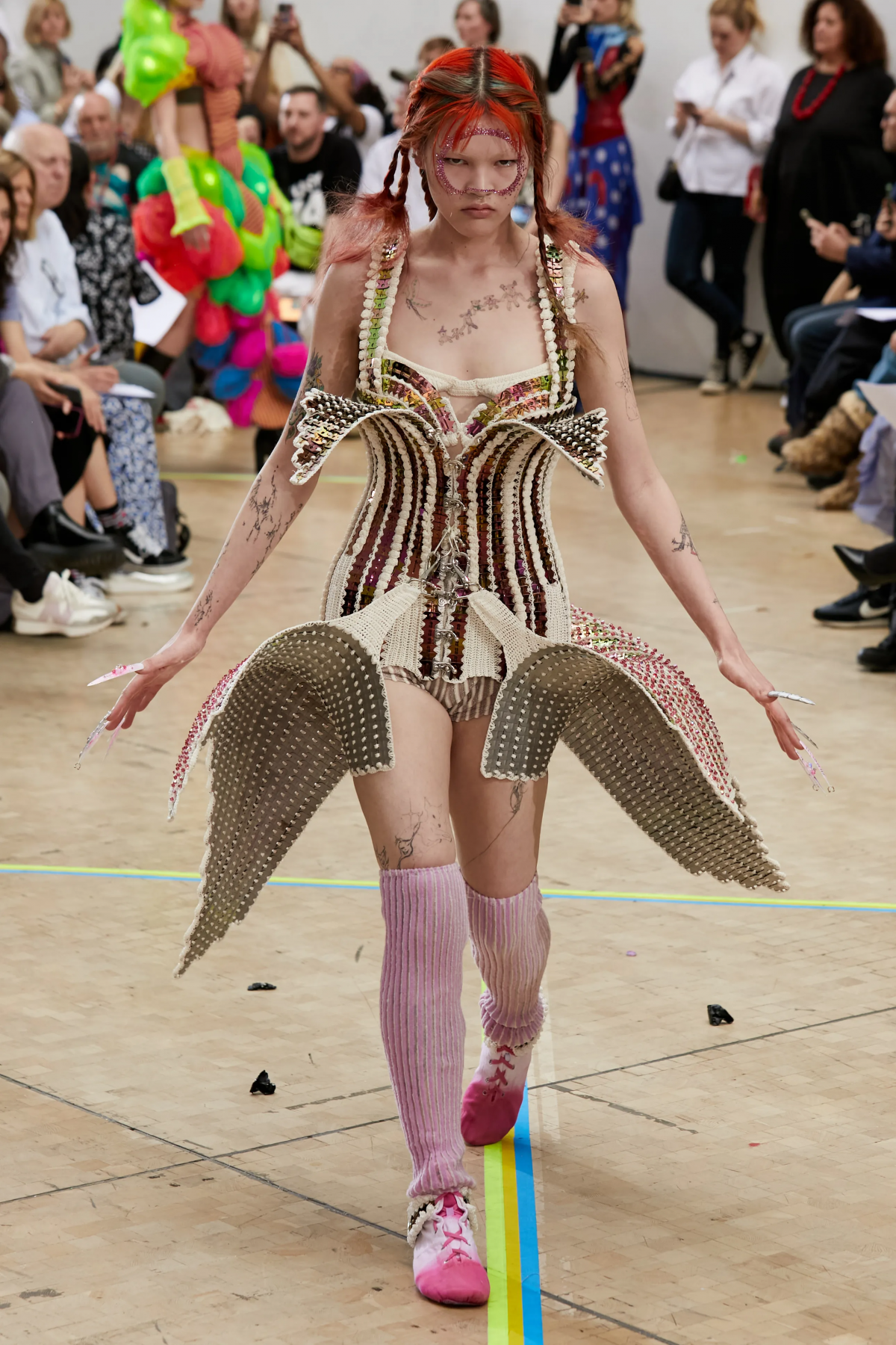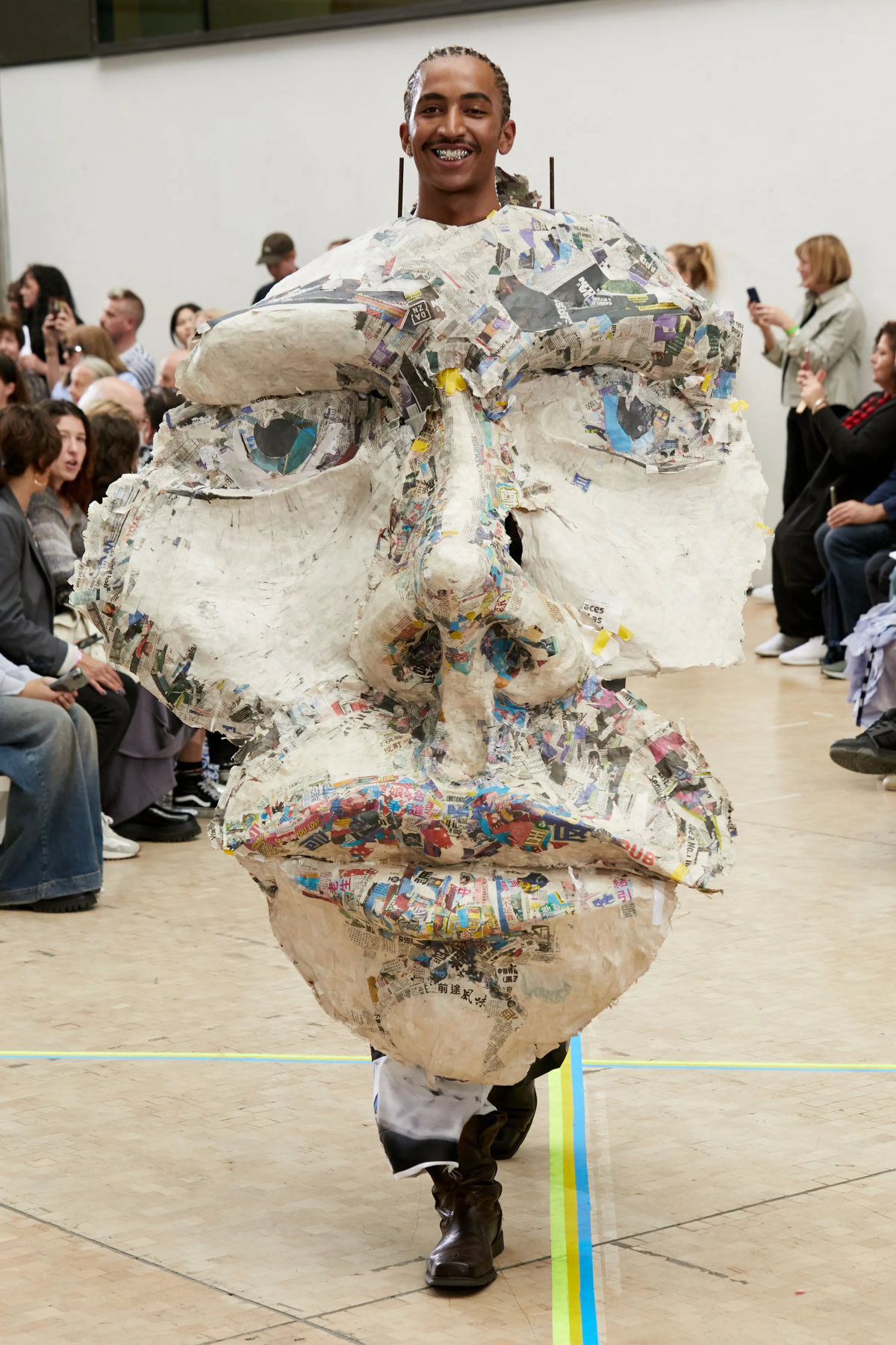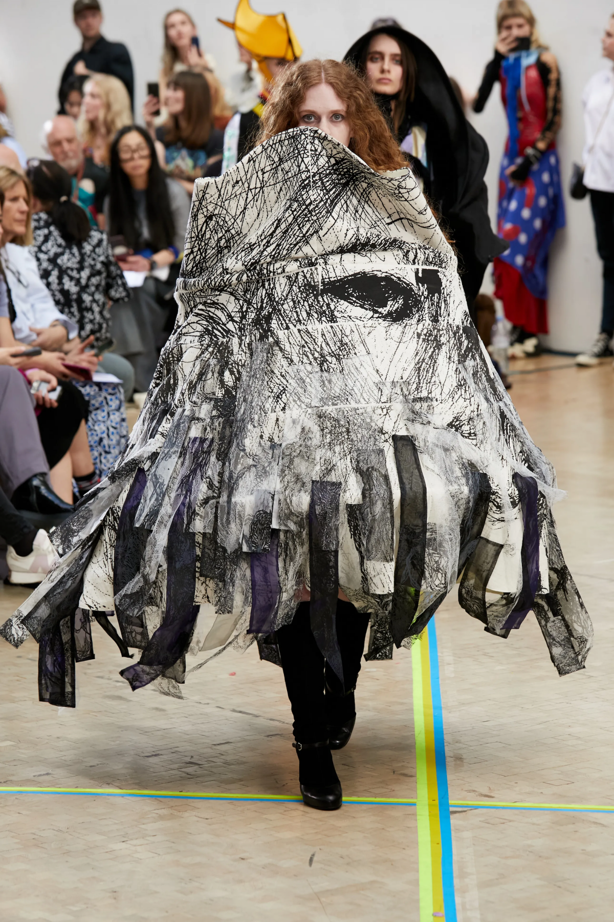 Faye Simister 的光學幻覺印花針織、Inok Chung 超現實主義拼接男裝,還有讓人目不轉睛的 Tilda Fuller 立體印花,以及 TJ Finley 以煙頭編織的網狀服裝,自帶強烈的信息元素。