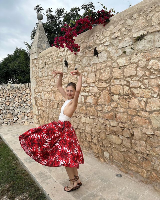 相較其他碎花,大概 High-low fashion 的呈現方式會較適合應用於日常穿搭。上身穿着極致簡約的純白襯衣或是背心,而在下身搭配與其形成巨大對比的誇張碎花裙,以這種方式來平衡一身的造型。例如時尚博主 Jenny Walton 與品牌 Carolina Herrera 在度假系列上的造型,又或是 Valentino 2023 春夏系列中銀色亮片花裙,也很好地展現了簡約與誇張單品的搭配風格。
