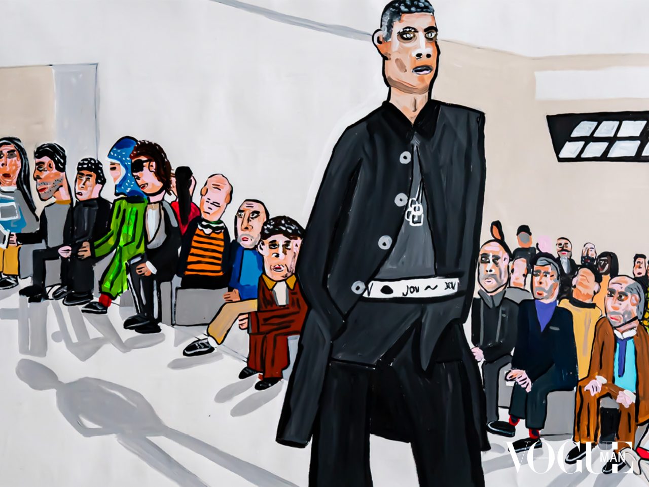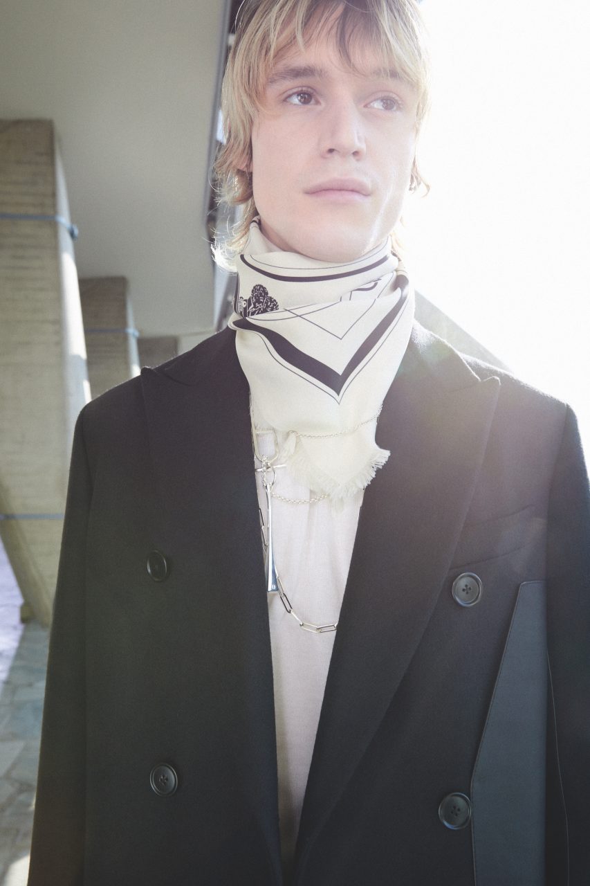 坐在杜樂麗花園外的巨型帳篷內,帳篷內幅牆投影出懾人的巨型臉孔,Robert Pattinson 等人訴說出英國詩人工. S. Eliot 筆下的河流意象:泰晤士河和塞納河成為連結倫敦和巴黎的元素,也是 Kim Jones 新一季Dior Men 的的靈感泉源。通常在 Cruise 和 Pre-fall 系列,Jones 手法會偏向潮流化和街頭,但在 main season 時,他更傾向回歸品牌的高訂時裝屋根源。第一個模特兒登場的全灰白造型為整個系列定調 :剪裁優雅的法式及膝大衣、雪紡透視背心、代表英倫戶外的兩靴,最後還有一條雪紡絲帶在背後搖曳。這個融合動感、實用性和陰柔氣韻的系列,啟發自65年前 Yves Saint Laurent 以天才少年姿態繼承 Dior 先生的時期。當年 YSL 為品牌注人了更年輕的活力,今天 Kim Jones 將典藏作品加以改良和更新,包括以鬆身騎兵斜紋布重製並改成修長的漁夫罩衫的 Paris 水手套裝、將Acacias 的露局剪裁放人羊毛西裝,既陽剛又嫵媚,既複雜洗煉又摩登實穿—在觀眾座背後更有弦樂五重奏演出,伴隨這個層次豐富而精準的新作,實在圓滿。