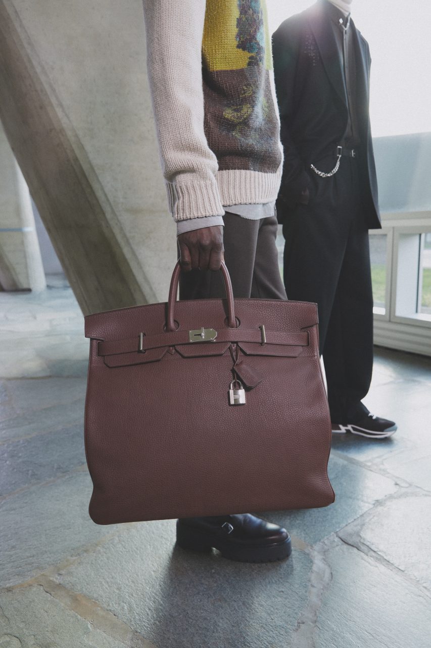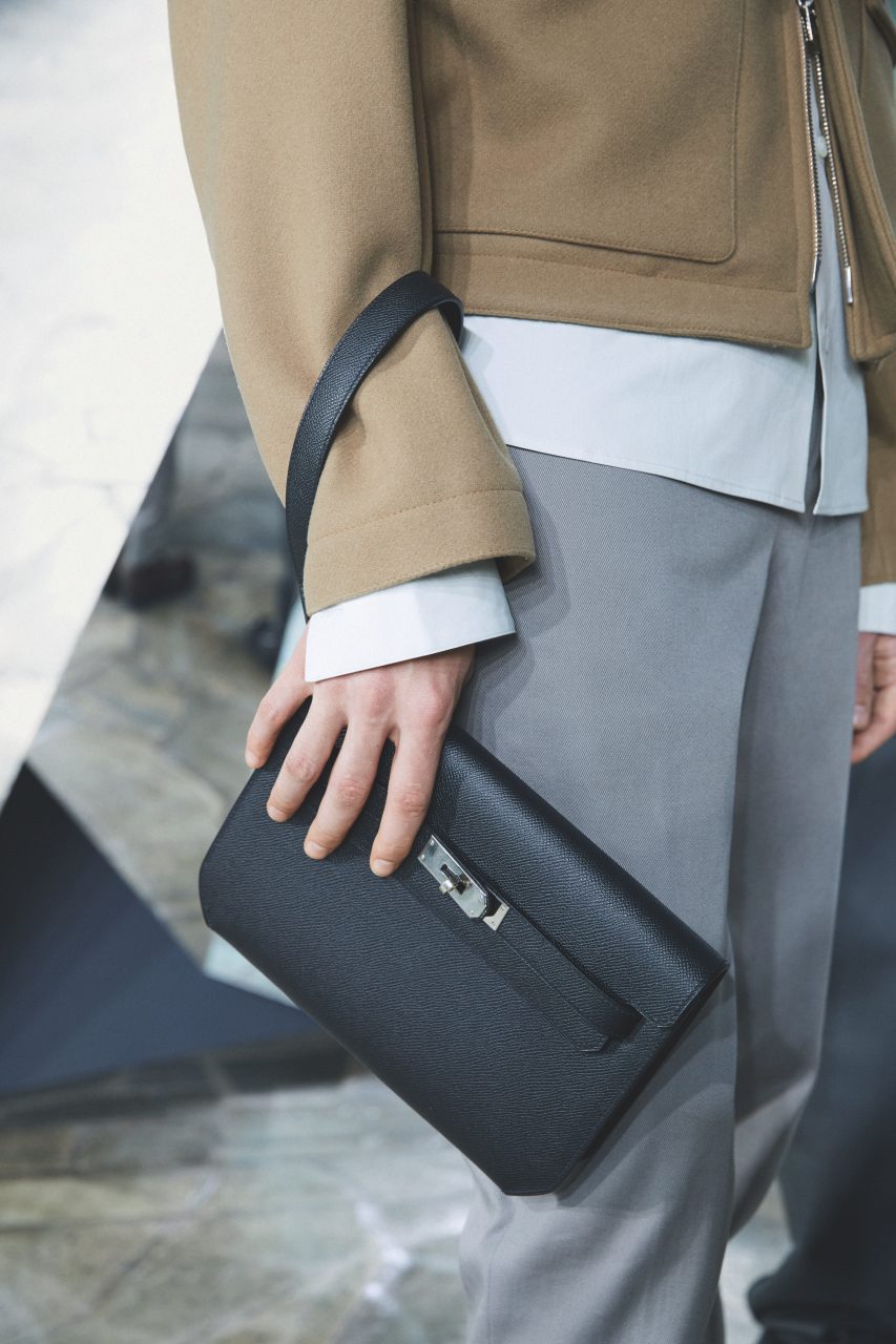 陽光明媚的冬日下午,我們坐在聯合國教科文組織總部聽 Hermès 說一個「線條的故事」。 Véronique Nichanian 今季塑造了一個更性感的愛馬仕先生,他們的服裝以木炭、礫石、焦糖、咖啡、海軍藍、象牙色和黑色為主調,用料是品牌核心的皮革和愛爾蘭針織(再在上面織皮,扮成補丁的細節)在衣領上有金屬扣設計,加上:一些耳環和項鏈,展現一種馴化的punk style,令造型線條銳利,誘人卻不危險。當然,最吸引還要數到模特兒手上的 Haut à courroies,採用了 Fjord、Togo及Barénia Faubourg 等精美皮革,加上側袋和厚重的硬件,一眾尊貴客戶又要爭相購買。